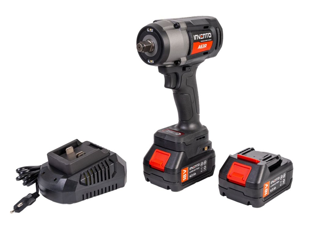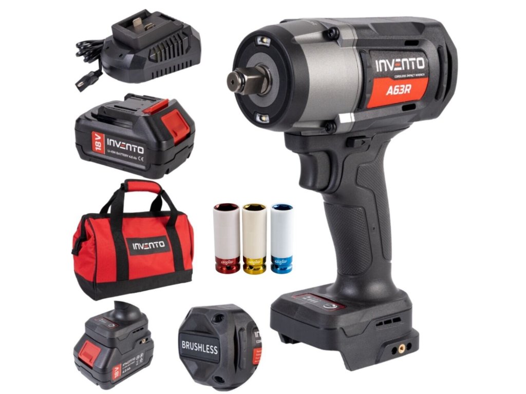 Akumulátorový rázový utahovák Invento A63R 1/2" 1180 Nm – sada 2× 4 Ah, nabíječka, taška, 3× hlavice na ALU kola