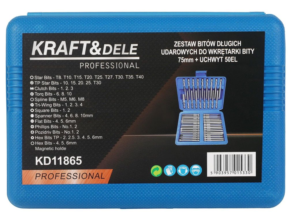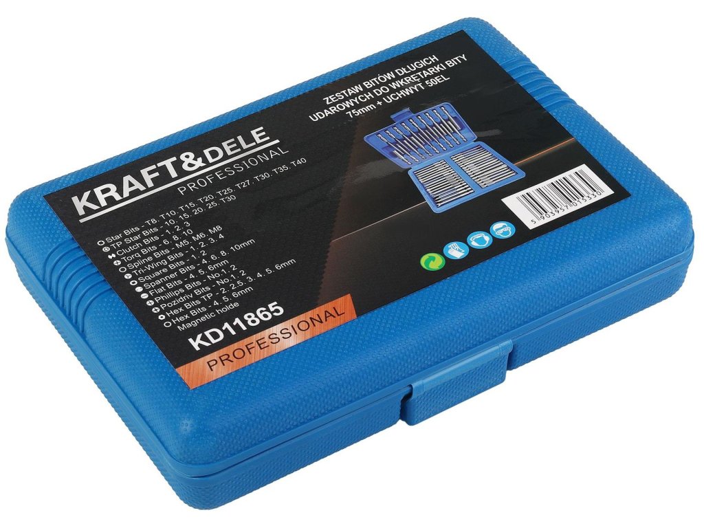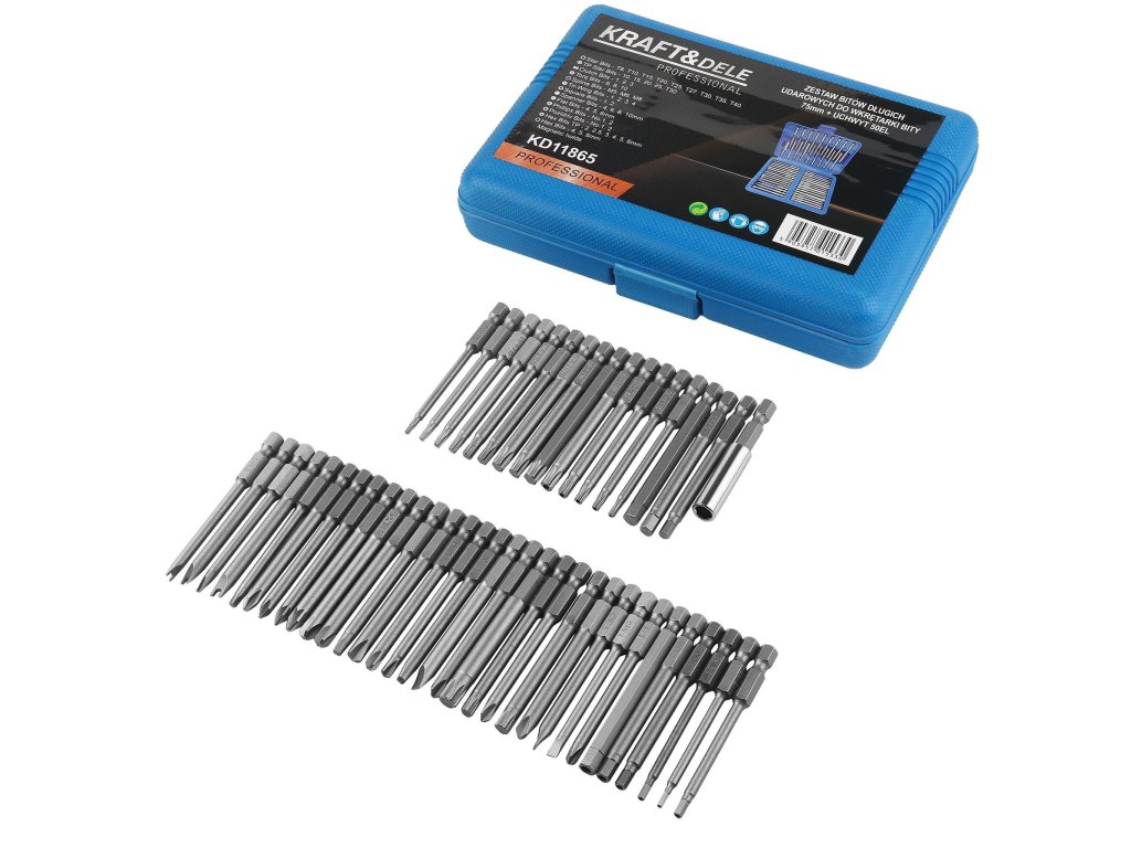 Sada dlouhých rázových bitů Kraft&Dele KD11865 je kompletní a praktický set 50 kusů bitů o délce 75 mm s magnetickým držákem, určený pro použití s aku vrtačkami a rázovými utahováky.