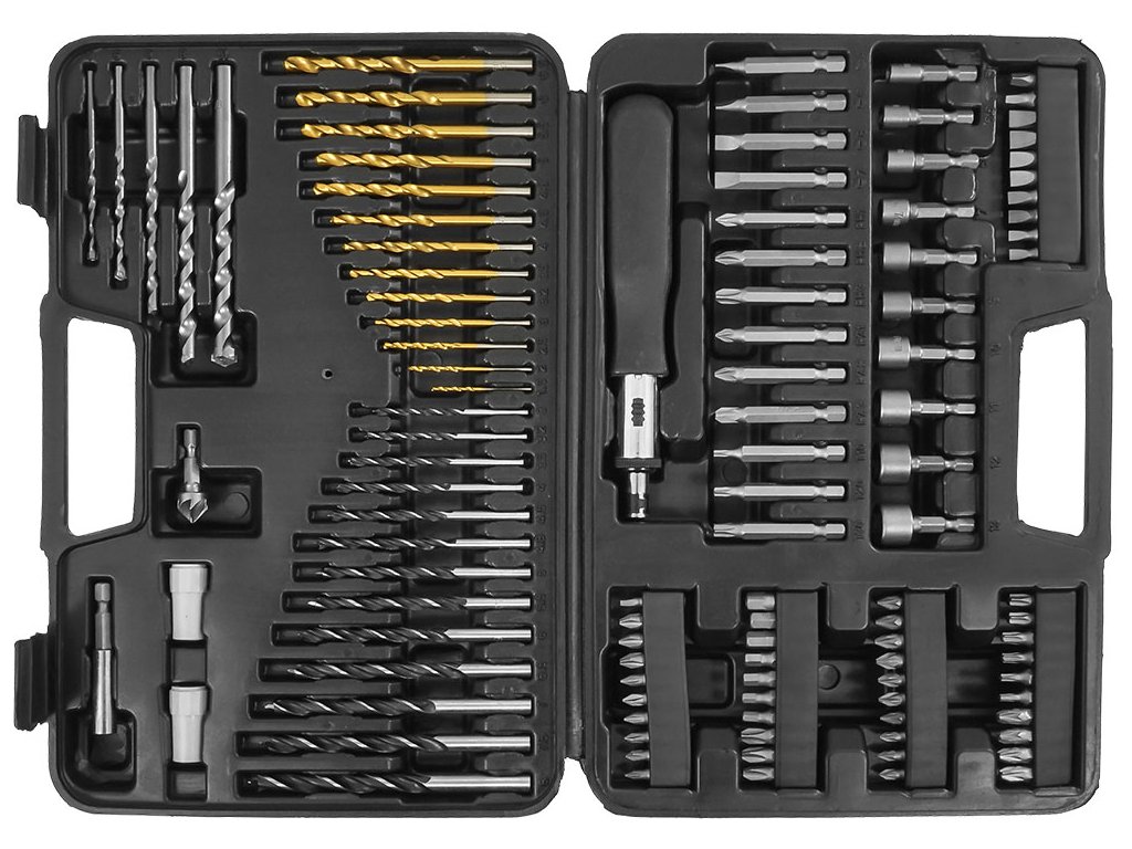 Sada vrtáků, bitů a nástrčných hlavic je ideální pro každého domácího kutila. Vše je umístěno v praktickém a ergonomickém plastovém kufříku.