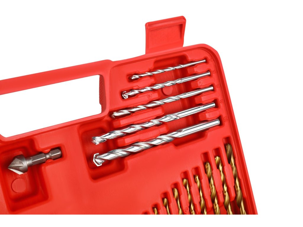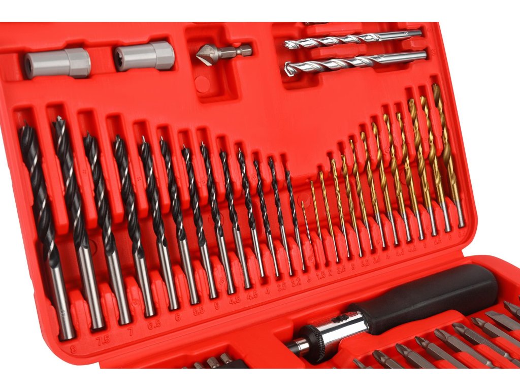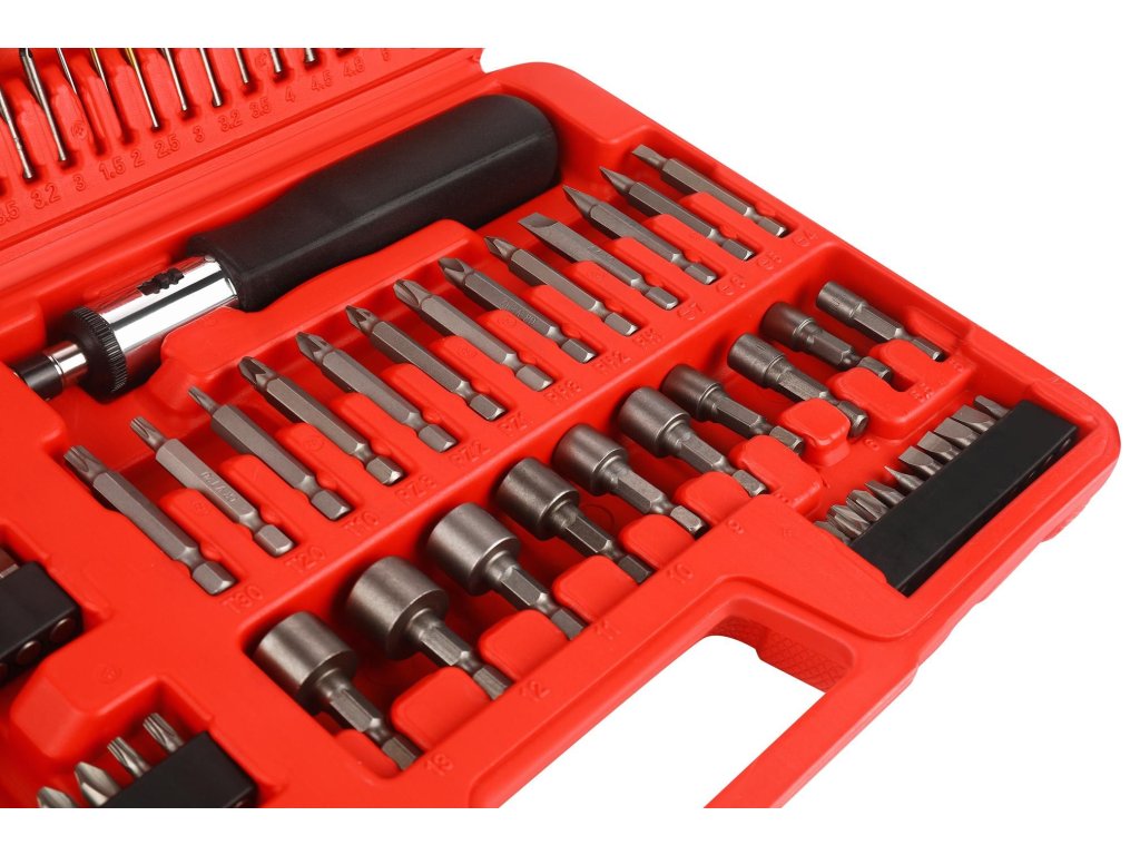 Vrtáky jsou vyrobeny z kvalitní rychlořezné oceli DIN 338, zušlechtěné kobaltem, což zajišťuje jejich odolnost a dlouhou životnost. Součástí sady je také ruční šroubovák s ráčnou a bohatý výběr bitů a nástavců, které umožňují efektivní práci v různých podmínkách. Celý komplet je uložen v odolném plastovém kufříku s organizérem pro snadné přenášení i skladování.