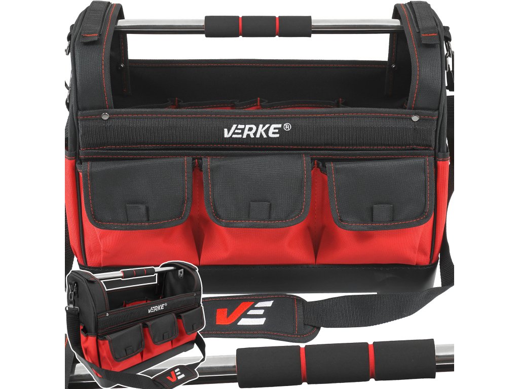Otevřená brašna na nářadí značky Verke je ideální pro ukládání a přepravu nářadí a příslušenství na staveništi, v garáži nebo dílně. Vyznačuje se pevnou konstrukcí, což z ní činí velmi praktickou a pohodlnou brašnu. Je vybavena příčnou tyčí s protiskluzovou rukojetí pro pohodlnější přepravu. Má vnitřní a vnější kapsy pro uložení šroubováků, kleští a dalších malých nástrojů. Velká komora zajišťuje pohodlný přístup k nářadí. Švy jsou zesílené a přizpůsobené pro velké zatížení. Materiál polyester 600D. Brašna má pevné dno a ramenní popruh.