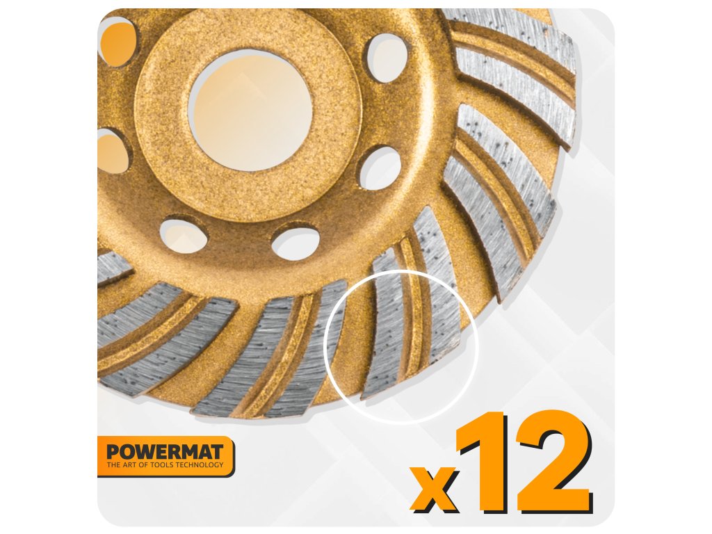 Kotouč je osazen 12 diamantovými segmenty, které zajišťují rovnoměrný úběr materiálu, stabilní chod a efektivní odstranění nerovností, zbytků malty nebo lepidla. Segmenty o výšce 6 mm prodlužují životnost kotouče a umožňují dlouhodobé používání i při náročnější práci.