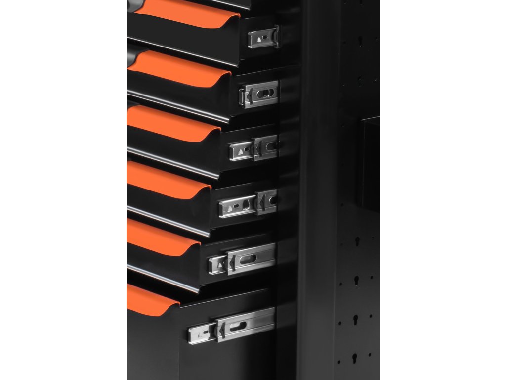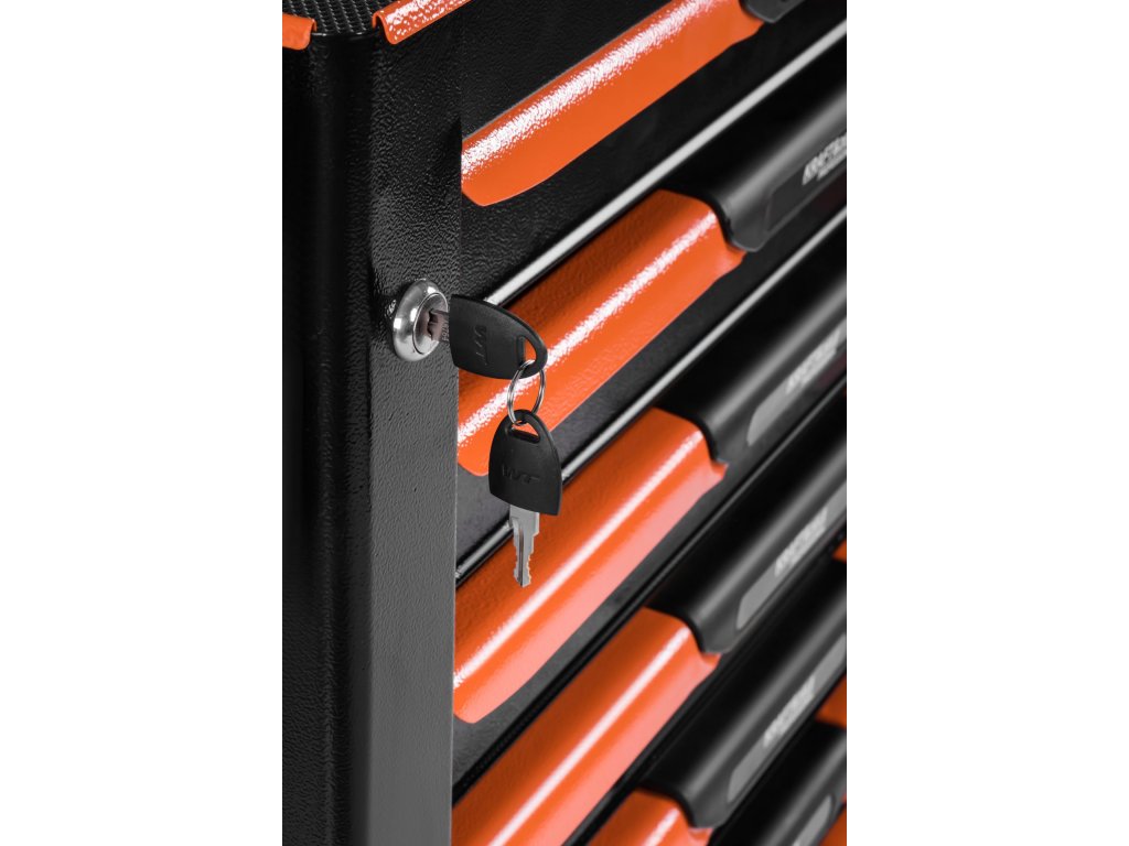 Pro bezpečnost je skříňka vybavena centrálním zámkem, který uzamyká všechny zásuvky najednou. Praktická boční police navíc poskytuje místo pro uložení menších doplňků. Robustní konstrukce s hmotností 45 kg zajišťuje dlouhou životnost a stabilitu.