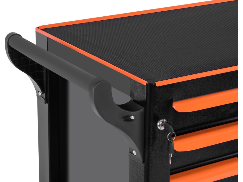 Horní pracovní deska je vyrobena z kvalitní oceli odolné vůči poškození a chemikáliím, díky čemuž se skříňka hodí i do náročného prostředí. Pohyblivá kolečka s brzdou usnadňují manipulaci a zajišťují stabilitu při práci.
