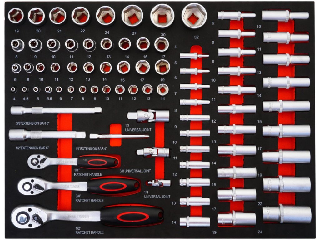 - 17x nástavce 1/2" (8, 9, 10, 11, 12, 13, 14, 15, 17, 19, 20, 21, 22, 24, 27, 30, 32 mm)