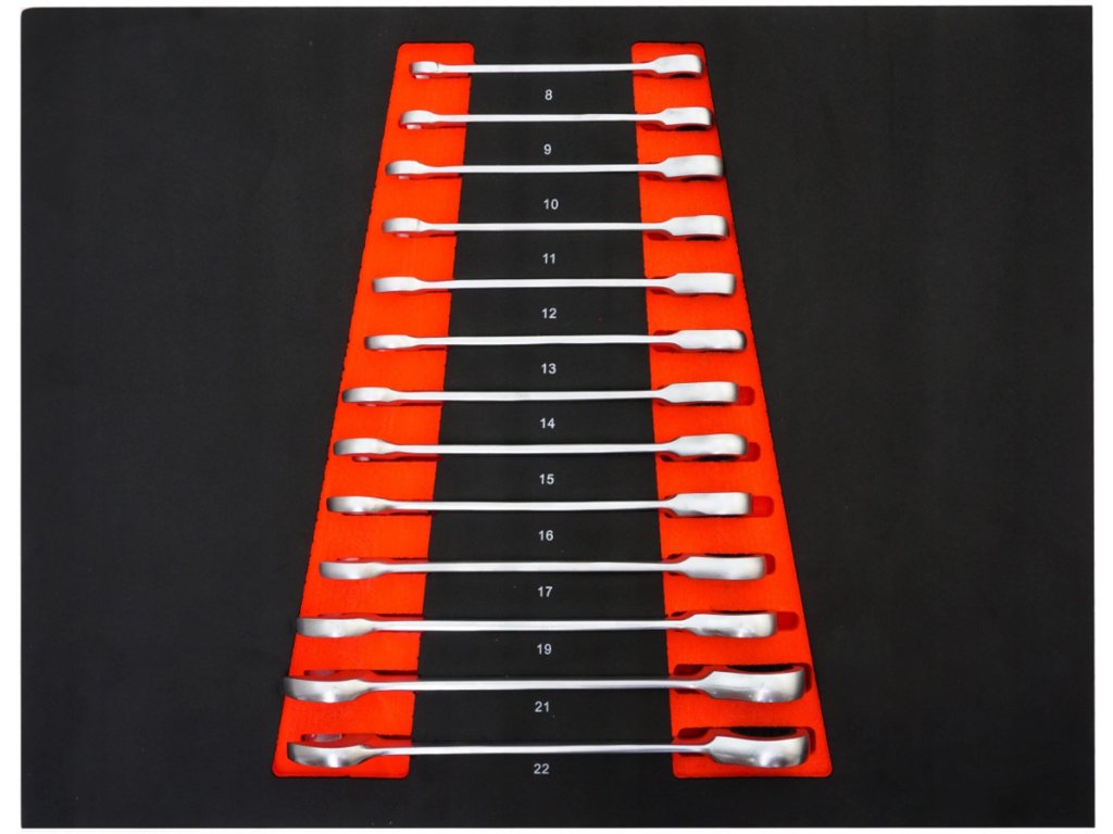 - 13x očkoploché klíče s ráčnou (8, 9, 10, 11, 12, 13, 14, 15, 16, 17, 19, 21, 22 mm)