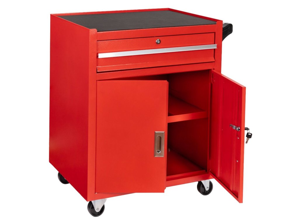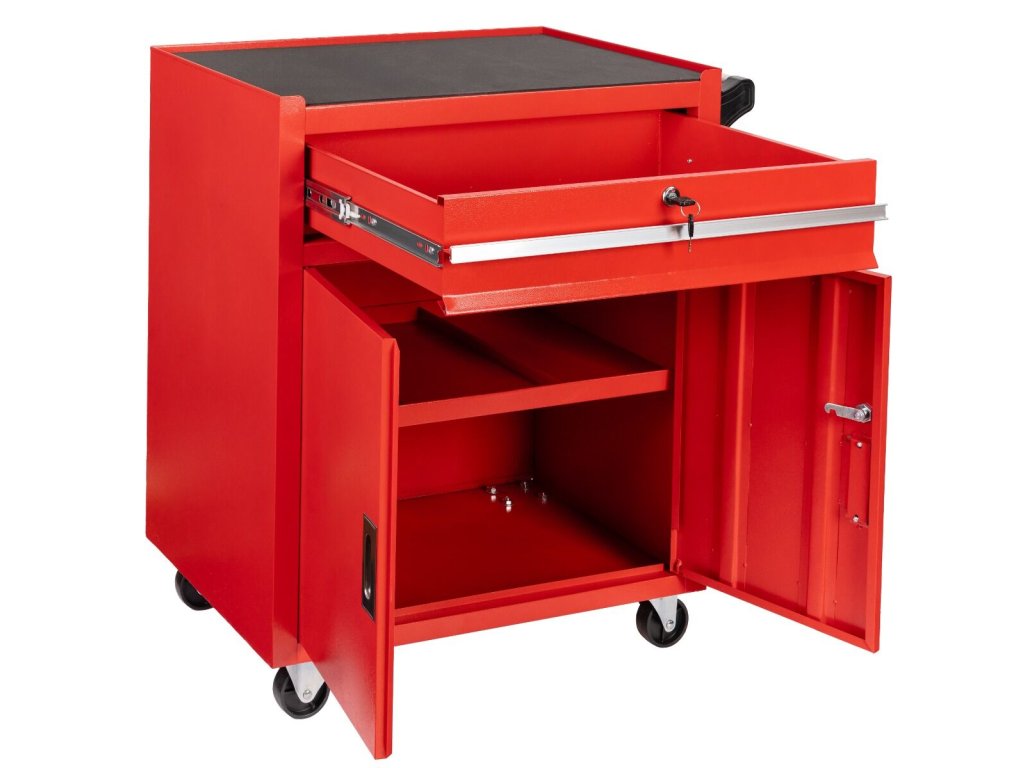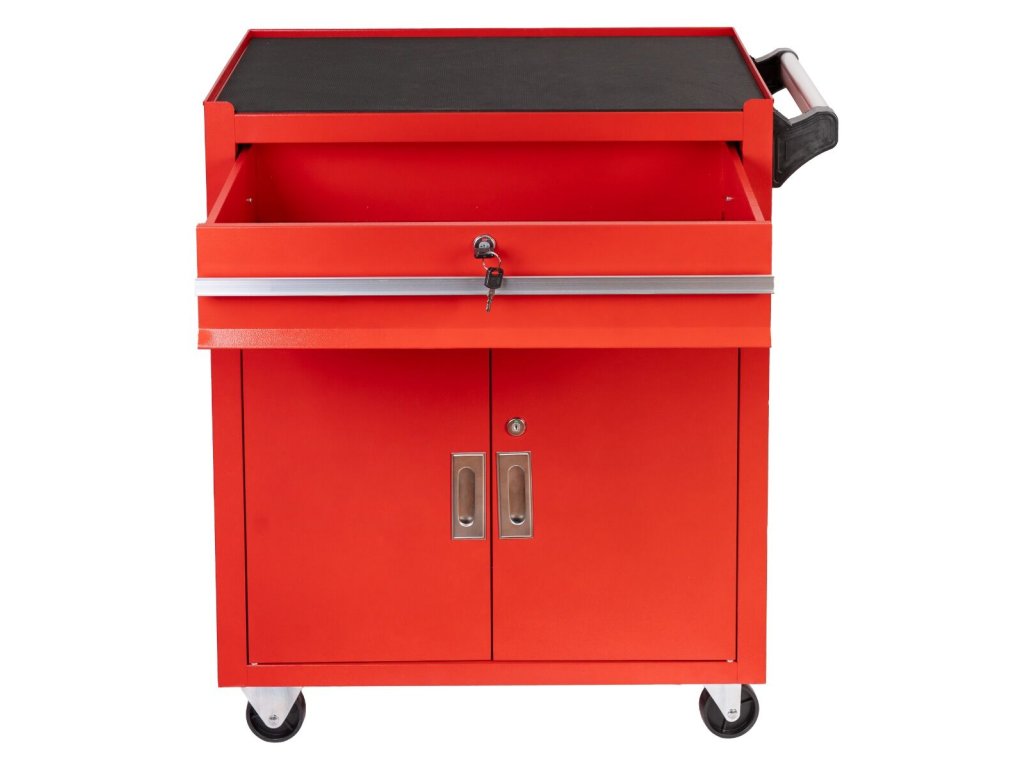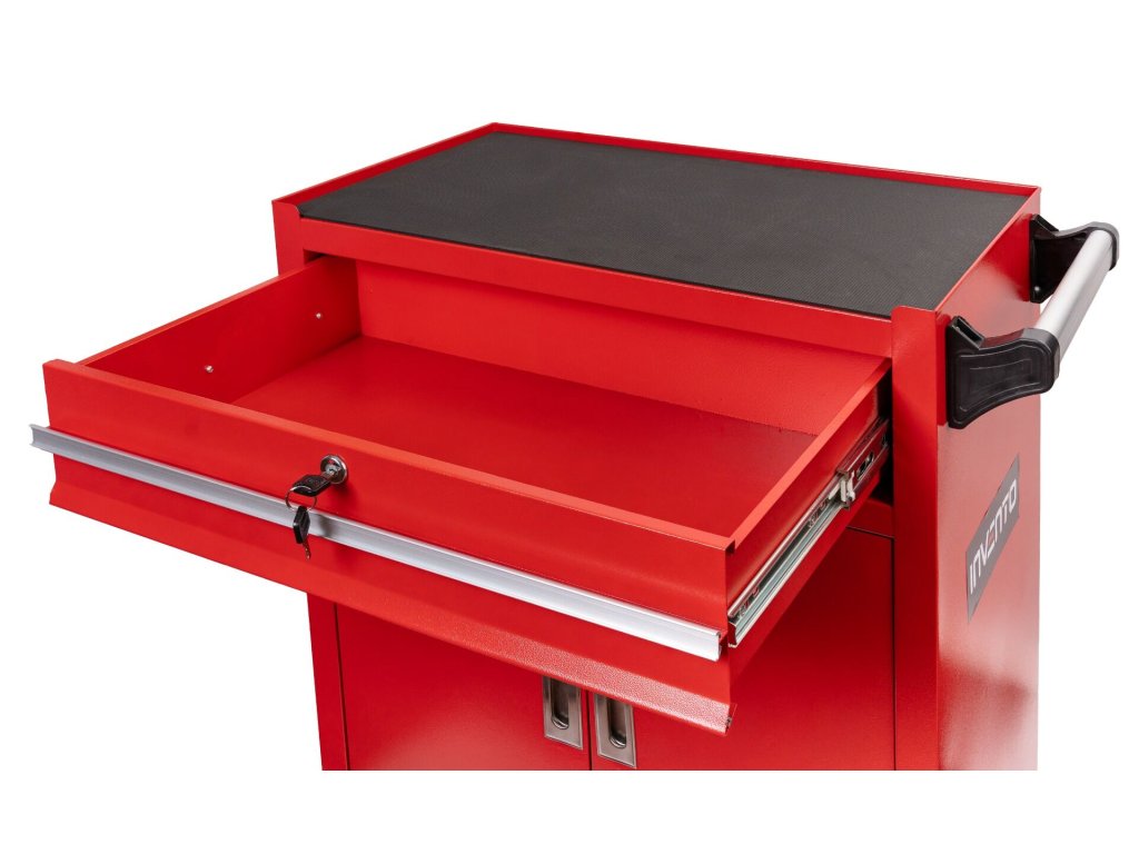 Uzamykatelný dílenský vozík Invento INVTL04 je praktickým a odolným řešením pro organizaci nářadí v profesionálních dílnách i domácích garážích. Kombinace prostorné zásuvky a dolní skříňky umožňuje přehledné uložení menších i větších nástrojů. Stabilní ocelová konstrukce a horní pracovní plocha s protiskluzovou podložkou poskytují bezpečné místo pro práci a odkládání nářadí.