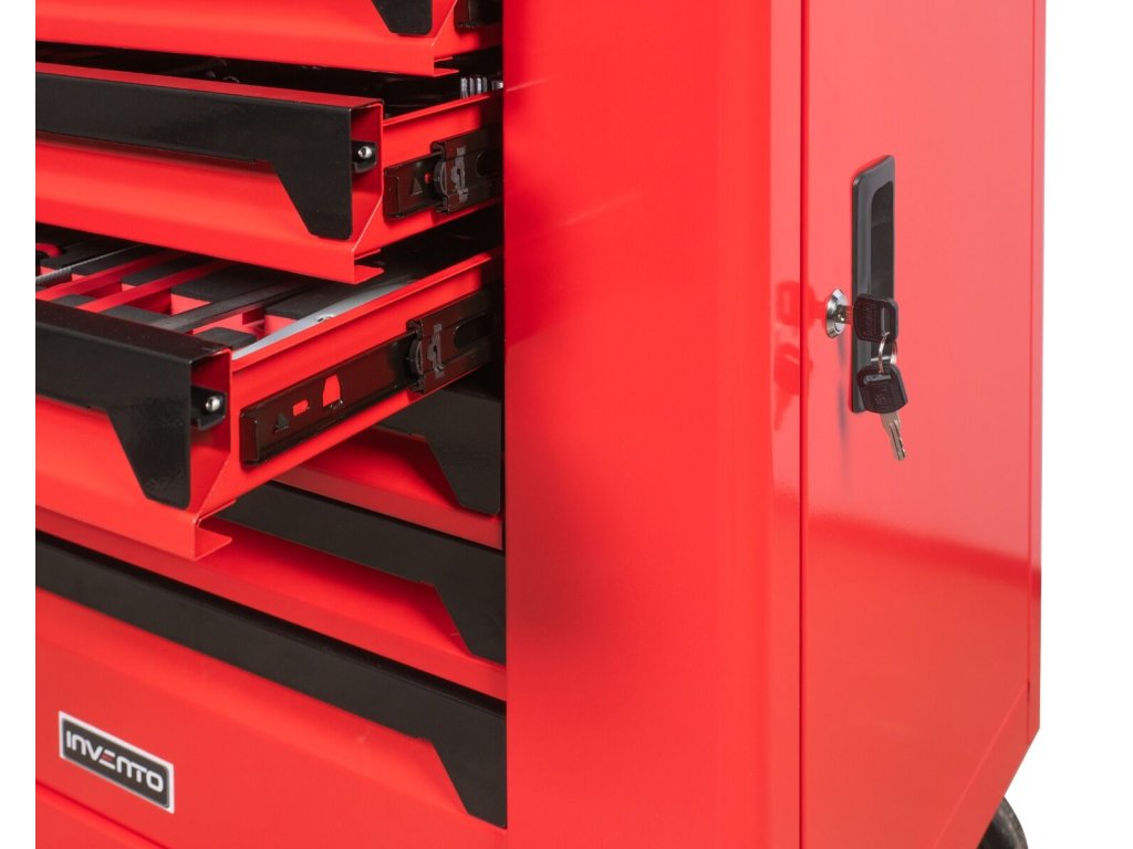 Konstrukce vozíku je založena na pevném ocelovém rámu. Horní ocelový blat poskytuje stabilní pracovní plochu a gumové hrany chrání vozík i okolí před poškozením. Všechny zásuvky mají blokaci proti samovolnému otevření a centrální zámek zajišťuje obsah proti neoprávněnému přístupu. Vozík je vybaven čtyřmi koly s brzdou pro snadný pohyb i stabilitu a navíc prostornou boční skříňkou na klíč pro větší nářadí nebo kapaliny.