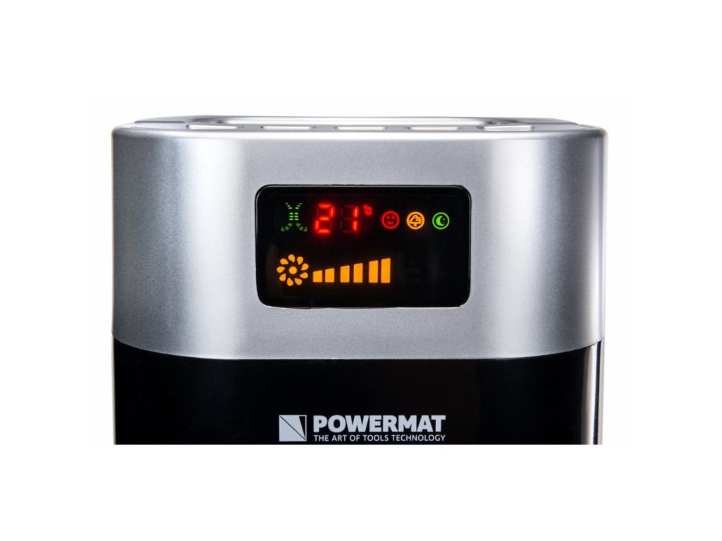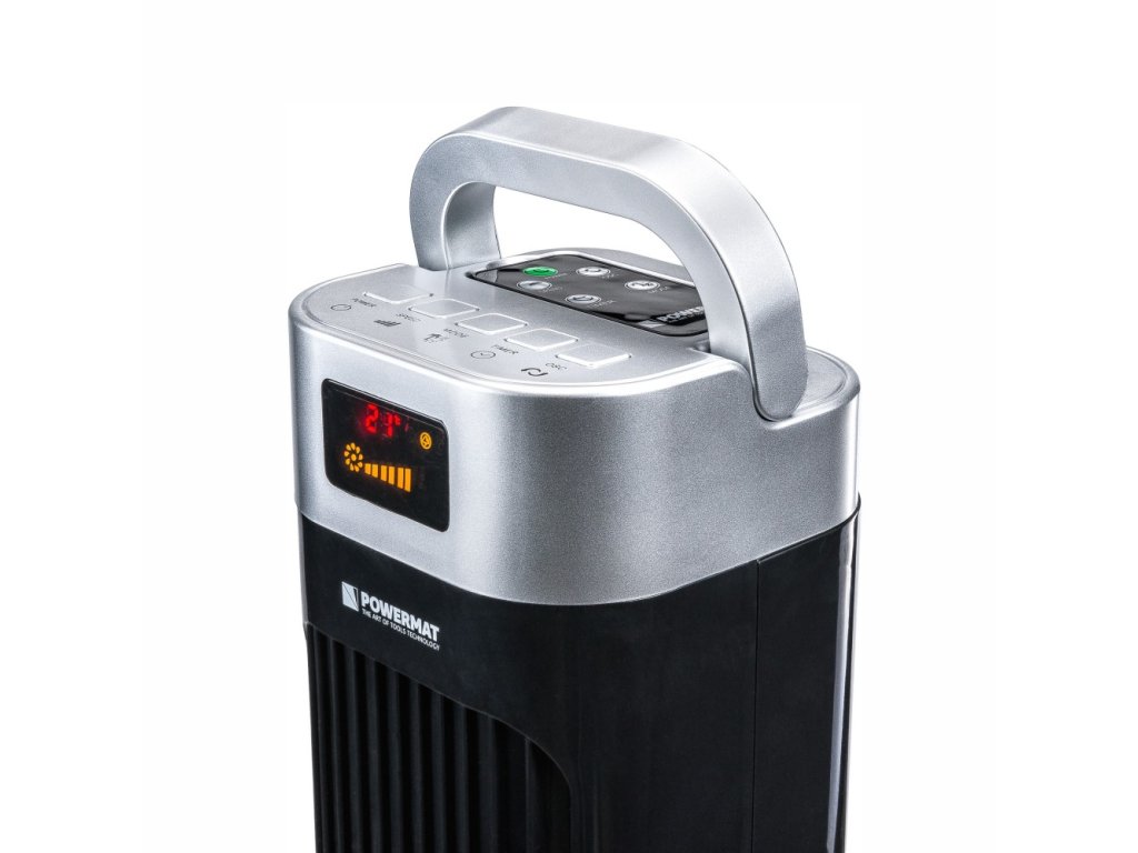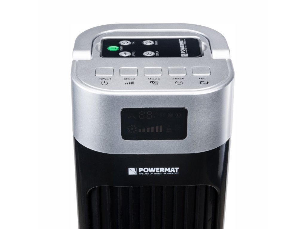Ventilátor sloupový 121cm, 90W, s dálkovým ovládáním, Powermat PM0626 v černém provedení je elegantní ventilátor, který se bude vyjímat v každé moderní místnosti nebo kanceláři. Axiálně uložený větrák s pracovní délkou 80 cm dokáže mnohem účiněji a příjemněji rozvádět vzduch po místnosti než běžné kruhové ventilátory. Ventilátor dosahuje nižší hlučnosti i meší spotřebu elektrické energie. Ukazatel pokojové teploty.