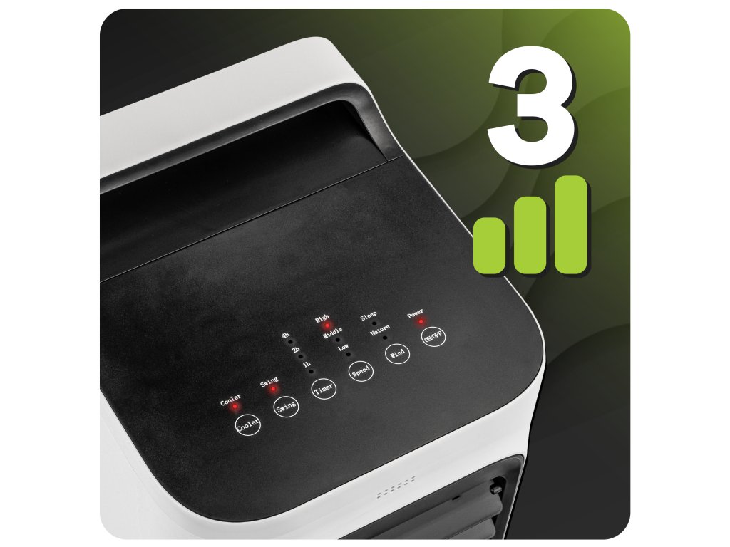 K dispozici jsou tři úrovně rychlosti proudění vzduchu – nízká, střední a vysoká – které umožňují přizpůsobení chlazení aktuálním podmínkám.