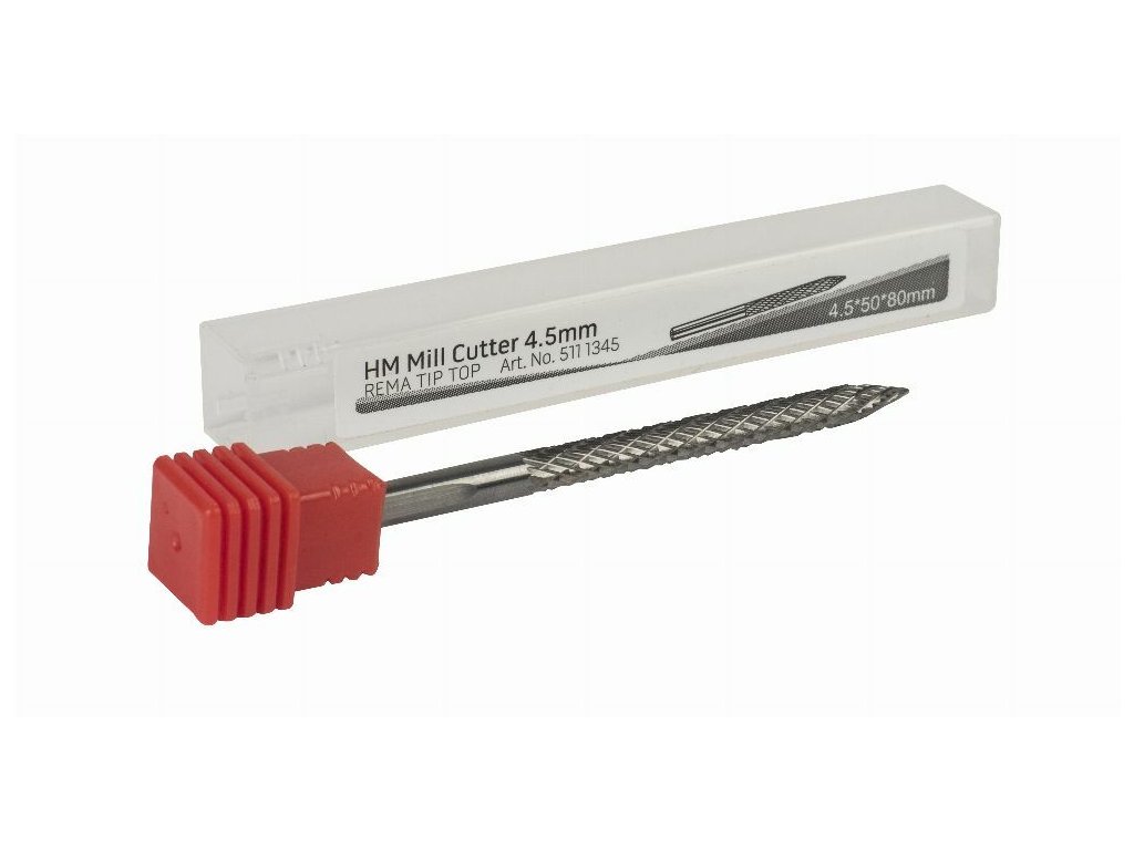 Fréza z tvrdokovu (Hartmetal) o průměru 4,5 mm od renomovaného německého výrobce Rema Tip Top je určena pro precizní kalibraci a opracování malých defektů pneumatik, zejména při přípravě otvoru po průrazu před aplikací opravného materiálu (např. hříbek nebo opravný kolík).