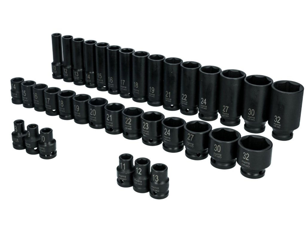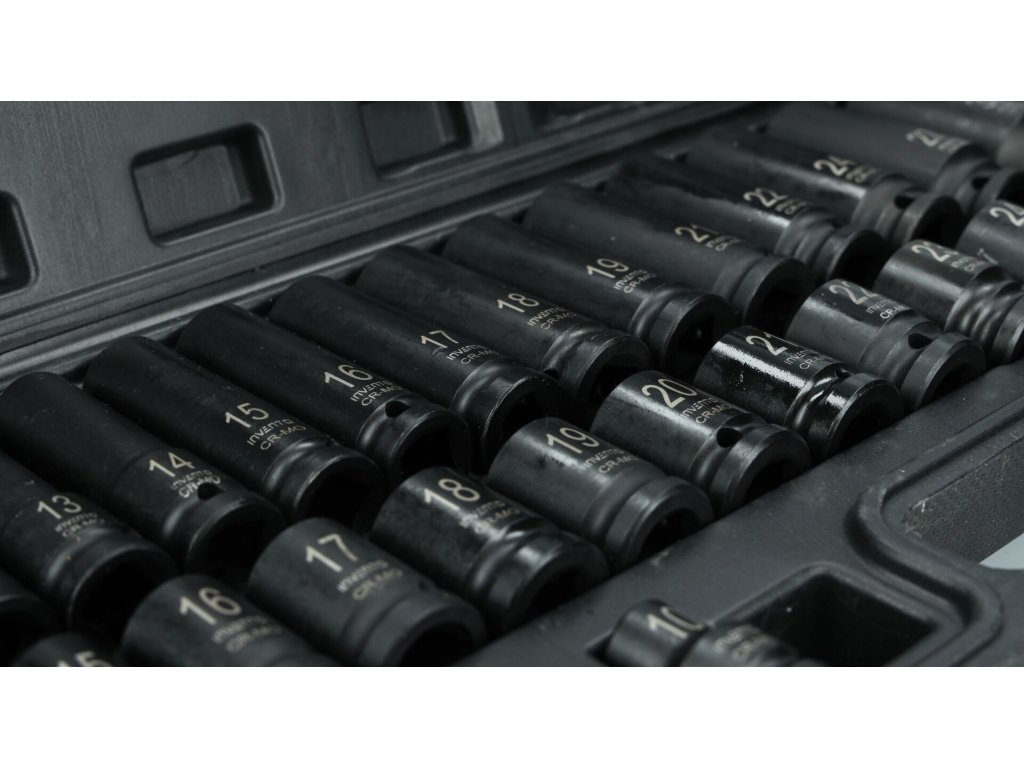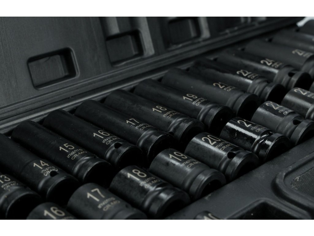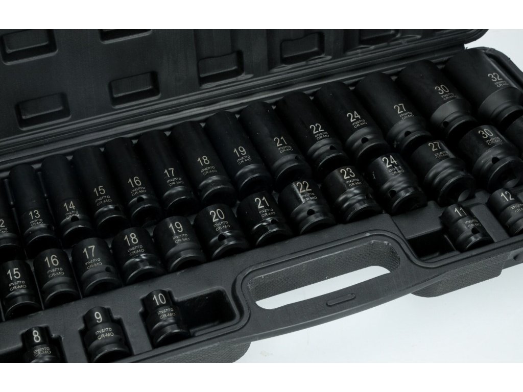 Profesionální sada 35 rázových nástavců INVENTO 1/2" je kompletní řešení pro práci s pneumatickými i elektrickými utahováky. Obsahuje dlouhé i krátké hlavice, díky čemuž je ideální pro širokou škálu úkolů – od servisu automobilů po montážní práce.