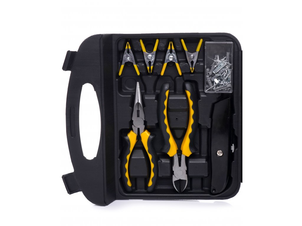 Kufr vyrobený z odolných plastů umožňuje udržet pořádek a snadno přenášet nářadí.
