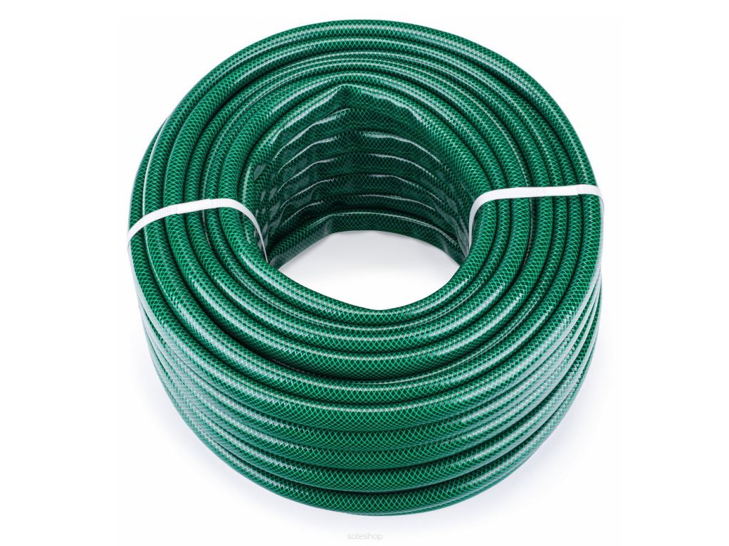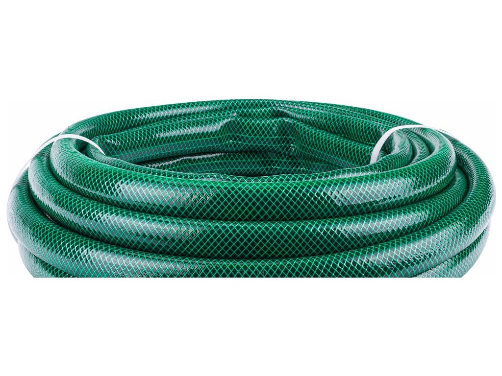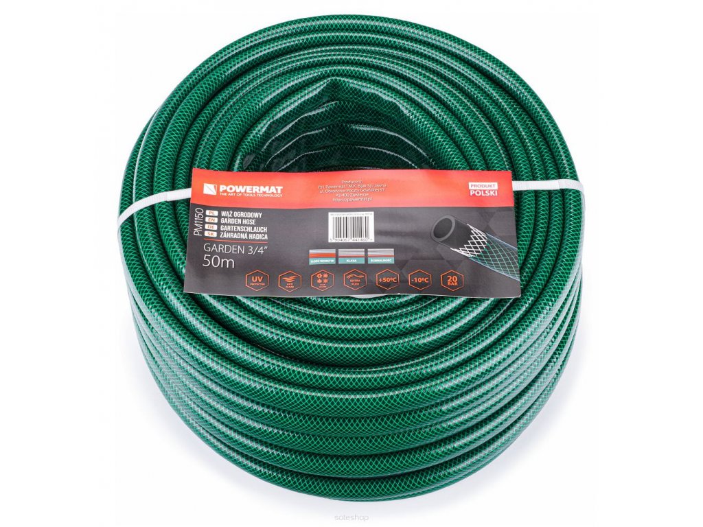 Zahradní hadice 3/4" 50 m, Powermat PM1150 byla vyrobena z velmi dobré kvality vnějšího materiálu PVC anti UV, křížového oplétání z syntetického vlákna a vnější pružné vrstvy PVC.