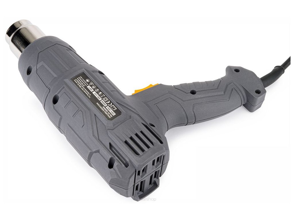 Horkovzdušná pistole 2 stupně, 4 trysky 600C 2000W PM-OP-2000MN, Powermat PM0997 je vybavena elektrickým motorem o výkonu 2000 W, který dosahuje teploty až 600 °C. Zařízení má dvě rychlosti, které umožňují volbu mezi dvěma teplotami a průtoky foukaného vzduchu.