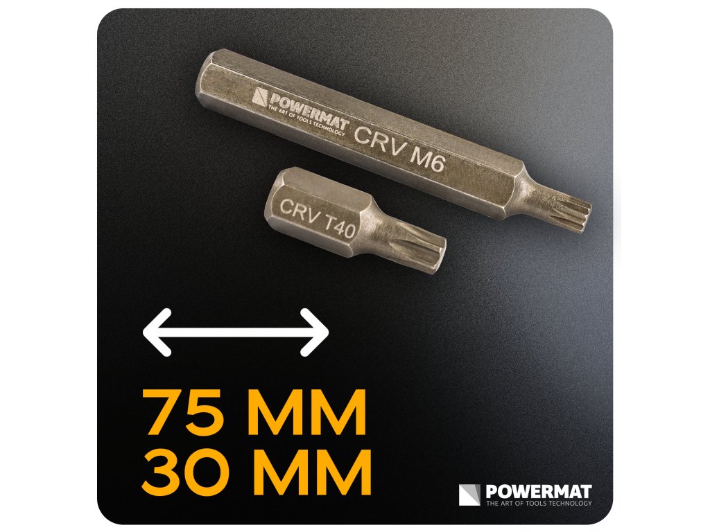 Bity jsou vyrobeny z chrom-vanadiové oceli (CrV), která zajišťuje vysokou pevnost a odolnost při práci s vyšším krouticím momentem.