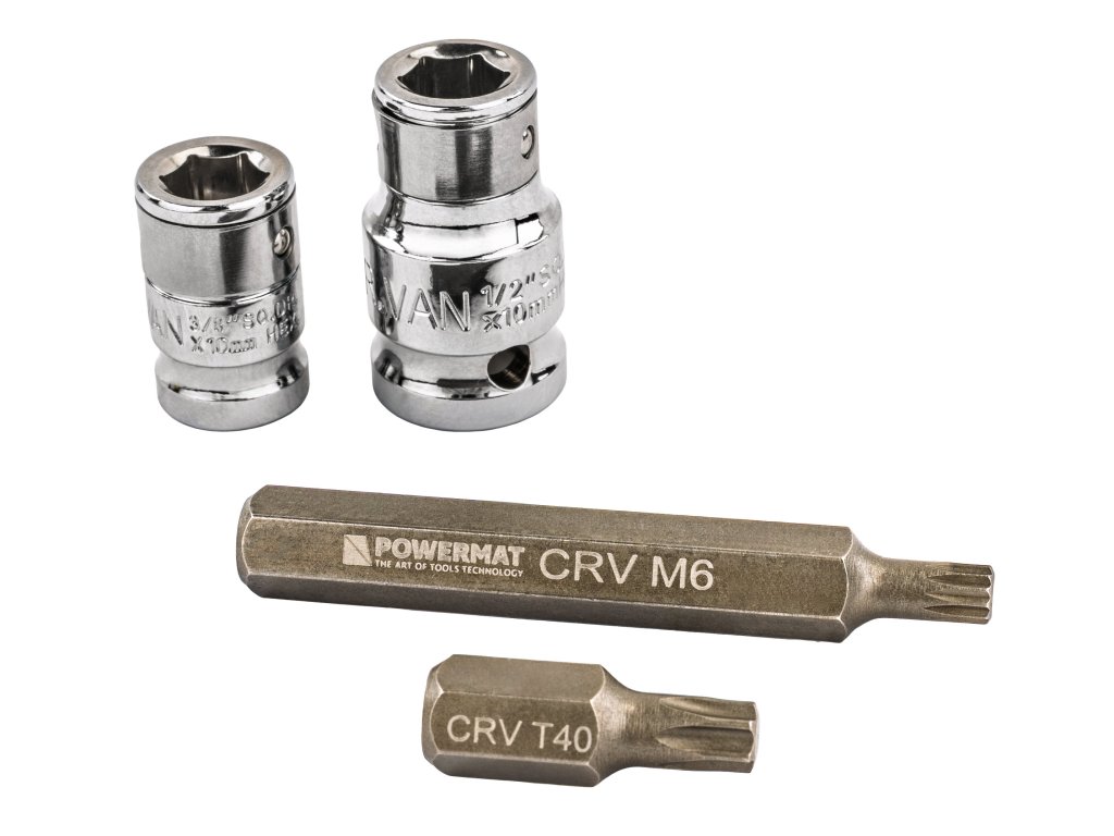 - Adaptéry: 1/2" a 3/8" na bity 10 mm
