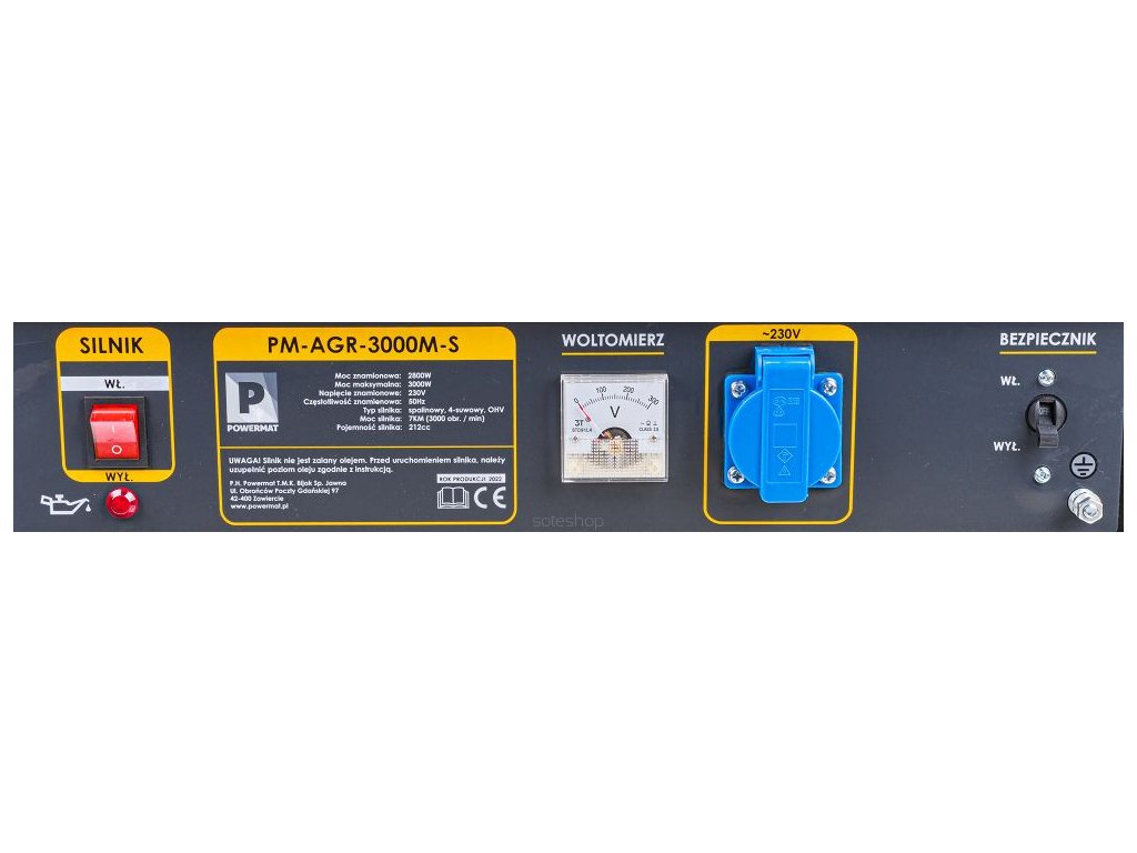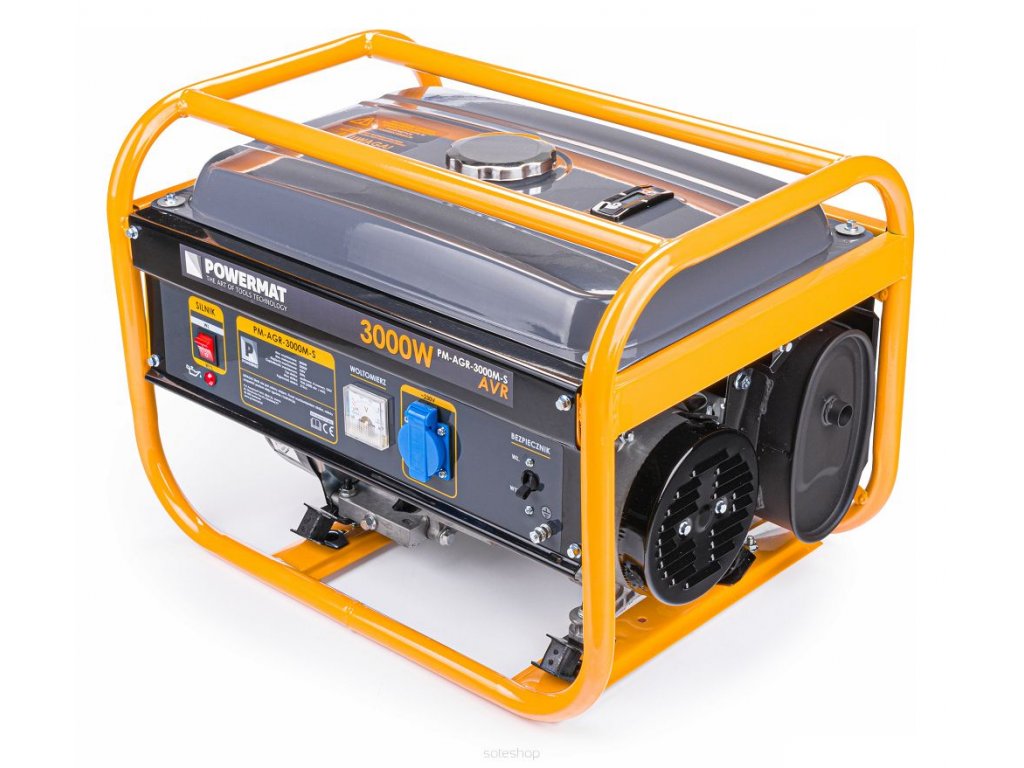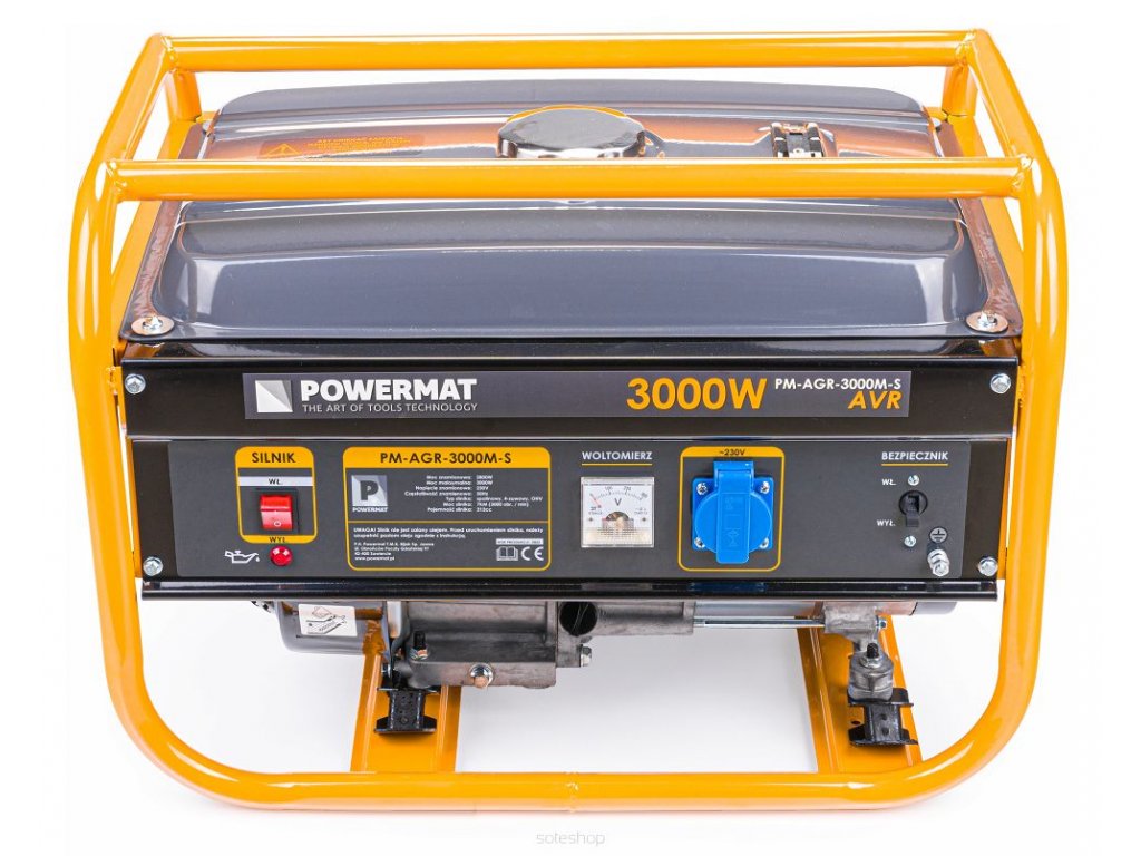 Generátor proudu elektrocentrála 3000W PM-AGR-3000M-S - Powermat PM1137 vyrábí proud o napětí 230 V (1 zásuvka). Ideální řešení při výpadku proudu v terénu. Je vybaven voltmetrem a pojistkami. Generátor má čidlo hladiny oleje, které automaticky vypne motor v případě příliš nízké hladiny oleje. Spouštění generátoru je manuální - pomocí šňůry. Generátor se používá v řemeslných pracích, stavebnictví, na pozemcích a v zahradách pro práci s elektrickými nářadími, čerpadly, osvětlením.