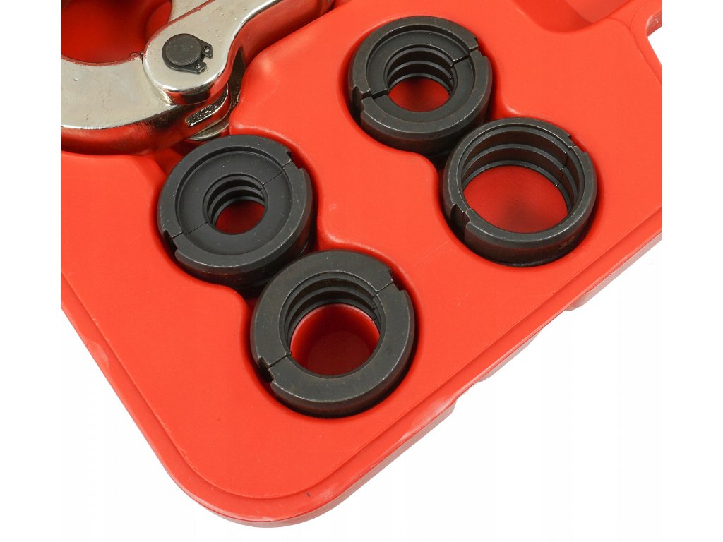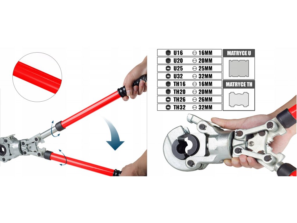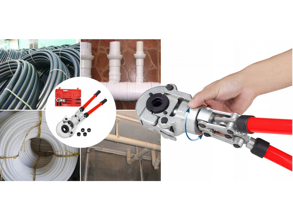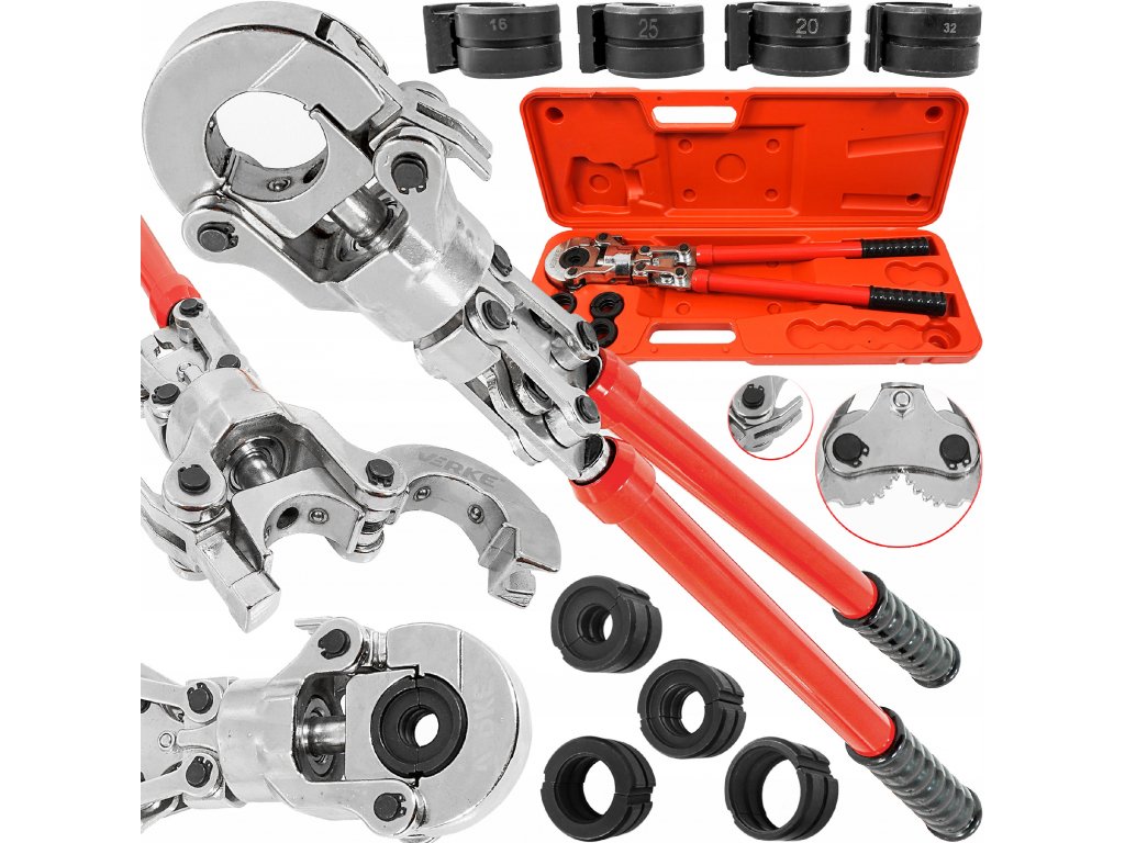 Ruční hydraulická lisovačka pro lisování spojek na trubkách PEX se sadou 4 matric. Lisovačka je vybavena hydraulickým válcem umožňujícím přesné a těsné lisování spojek silou 60 kN. Otočná hlava 360° umožňuje práci v těžko přístupných místech. Teleskopické rukojeti, které lze prodloužit z 57 cm na 80 cm, snižují sílu potřebnou k lisování spojek. Systém rychlé výměny matric umožňuje snadnou výměnu matric podle potřeby. Lisovačka je vybavena sadou spojek: