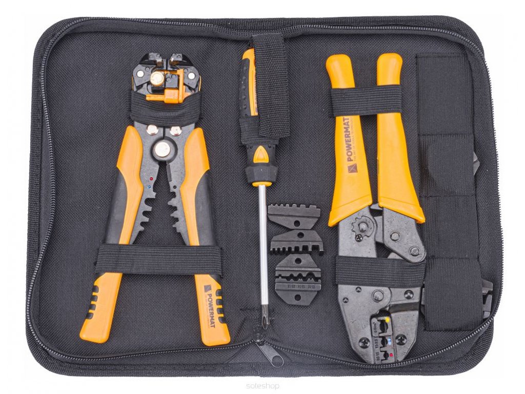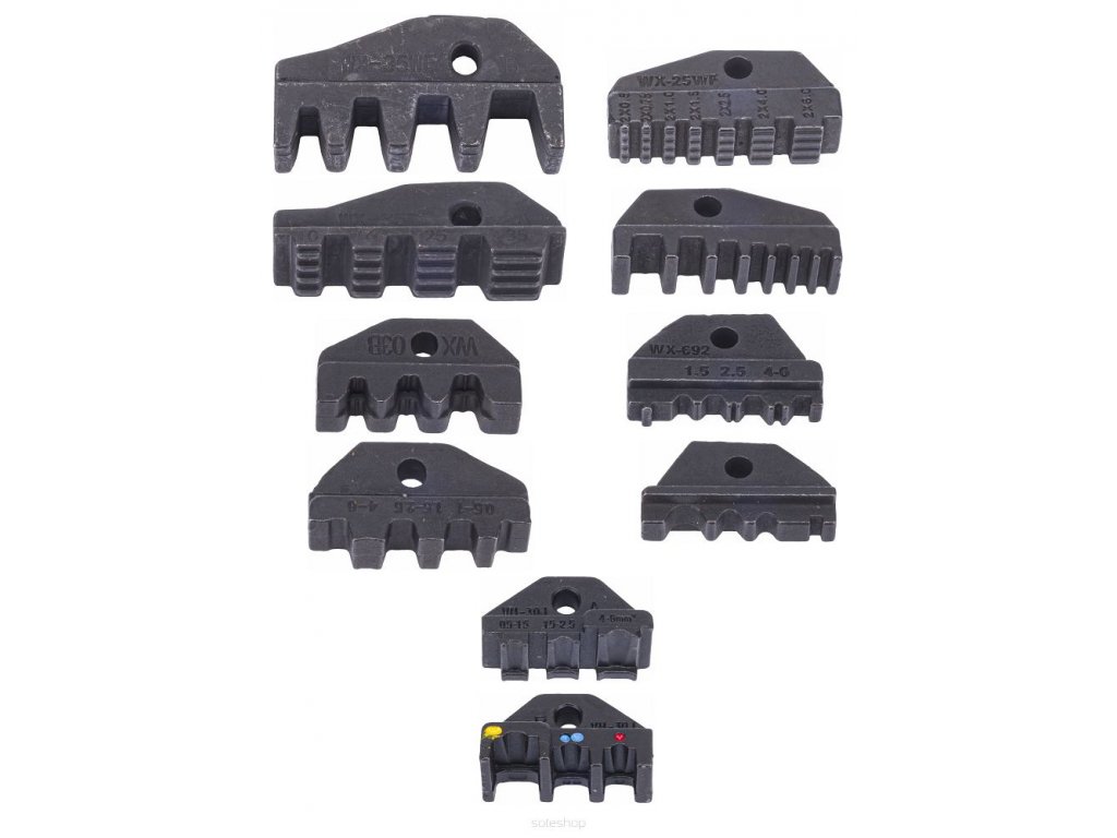 - Sada obsahuje automatické kleště s nastavitelným západkovým mechanismem a vyměnitelnými matricemi přizpůsobenými pro pět typů elektrotechnických spojů. Výměna matric se provádí odšroubováním dvou šroubů.
