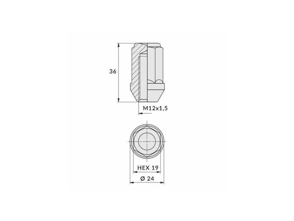 Kolová matice M12x1,5 – uzavřená, kuželová, klíč 19, výška 34 mm