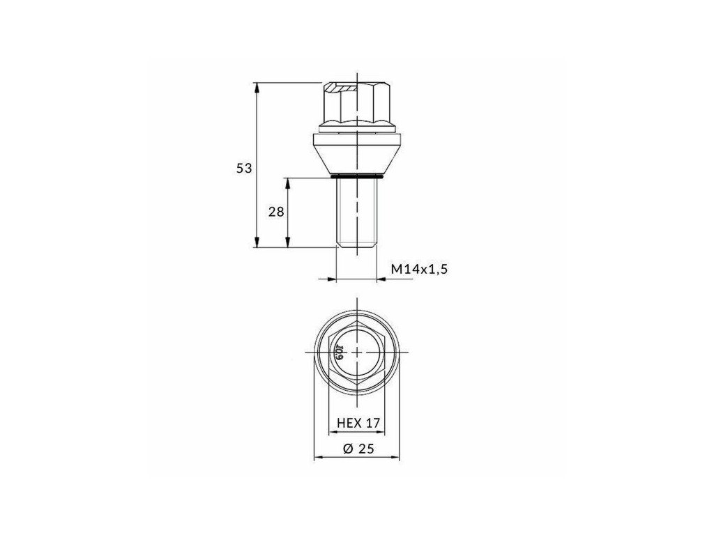 Šroub na kola M14x1,5, plovoucí kužel, závit 28 mm, klíč 17