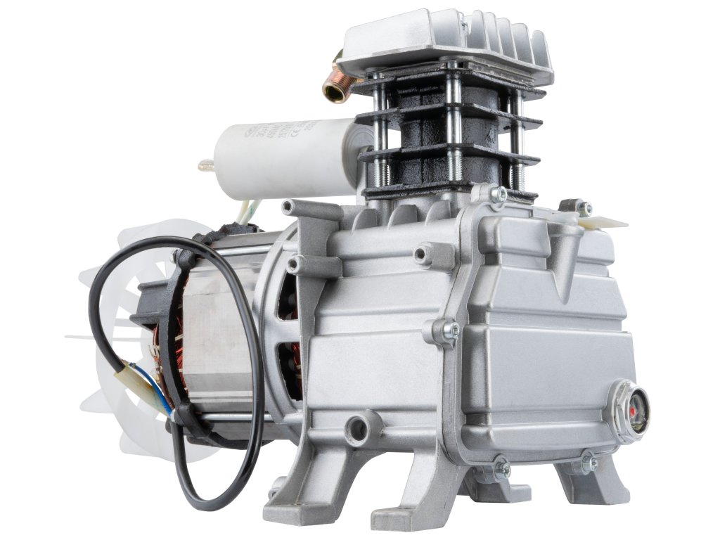 Kompresorová hlava je vyrobena z odolné slitiny hliníku a oceli, což zaručuje nízkou hmotnost, efektivní odvod tepla a dlouhou životnost.
