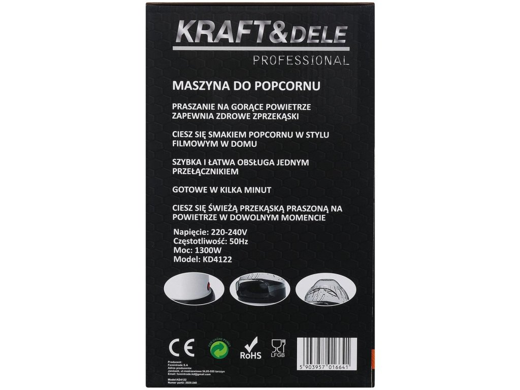 Popcornovač Kraft&Dele KD4122 je ideálním řešením pro milovníky čerstvého popcornu, kteří si cení rychlosti, pohodlí a zdravého způsobu přípravy občerstvení. Díky kompaktnímu provedení a atraktivnímu designu se skvěle hodí jak do domácnosti, tak i na večírky, rodinná setkání nebo filmové večery.
