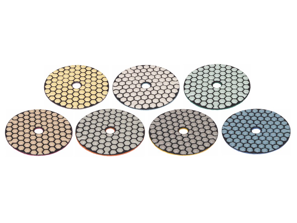 - Profesionální sada 7 diamantových kotoučů určená pro broušení a leštění tvrdých povrchů, jako je kamenina, keramika, beton, žula, mramor nebo pískovec.