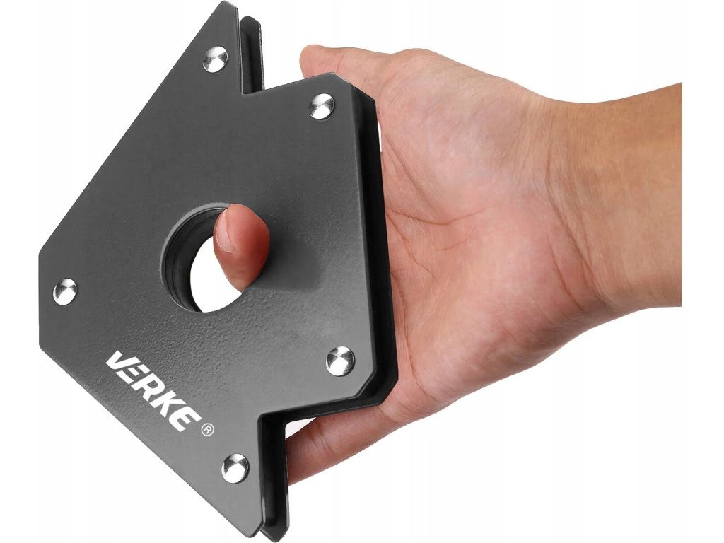Magnetický úhelník vyrobený z ocelového plechu a silných feritových magnetů. Umožňuje přesné spojování materiálů pod následujícími úhly: 45°, 90° a 135°. Nosnost magnetu je cca 34 kg. Povrch magnetového pouzdra je lakován práškovou barvou. Určen k dočasnému spojování kovových prvků během svařování, vrtání, lakování. Použití magnetického úhelníku umožňuje volné ovládání oběma rukama a předběžné sestavení spojovaných kovových prvků bez pomoci další osoby.