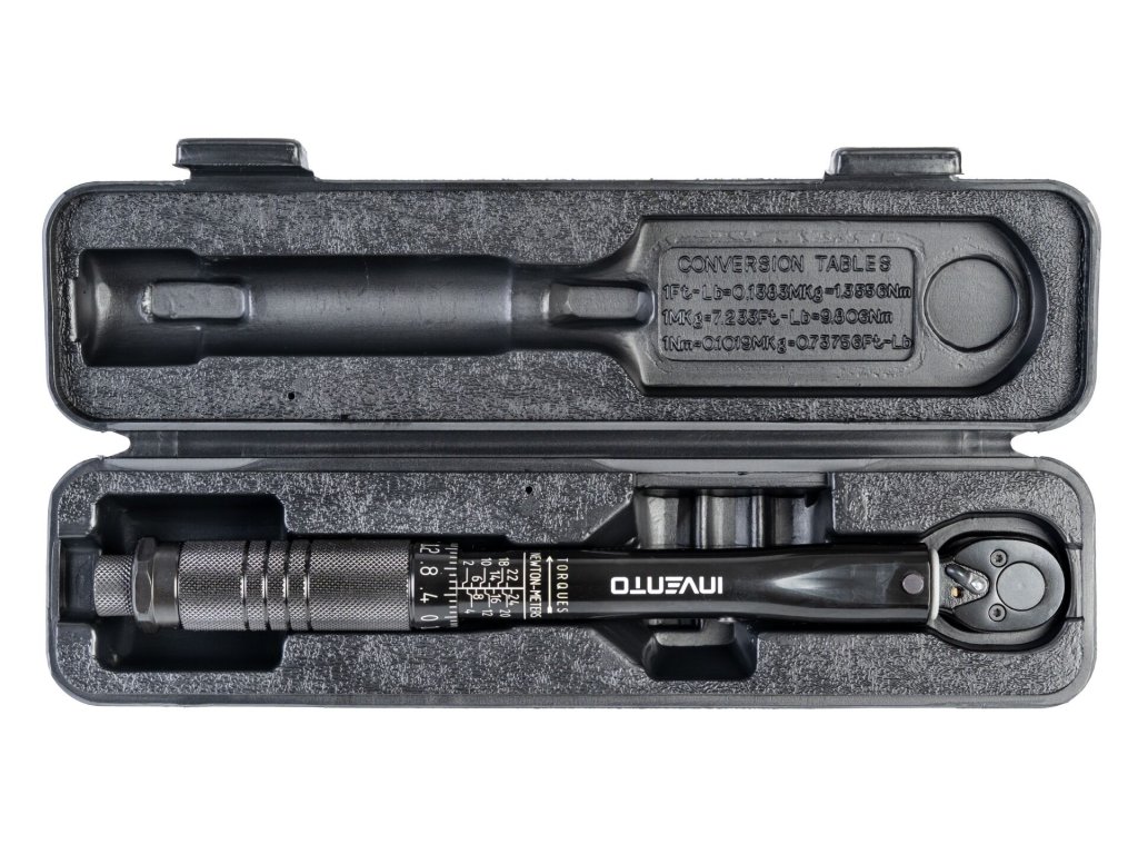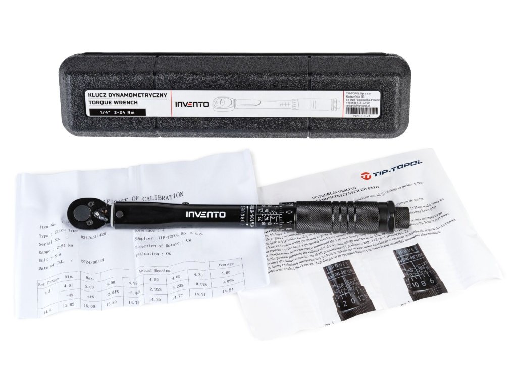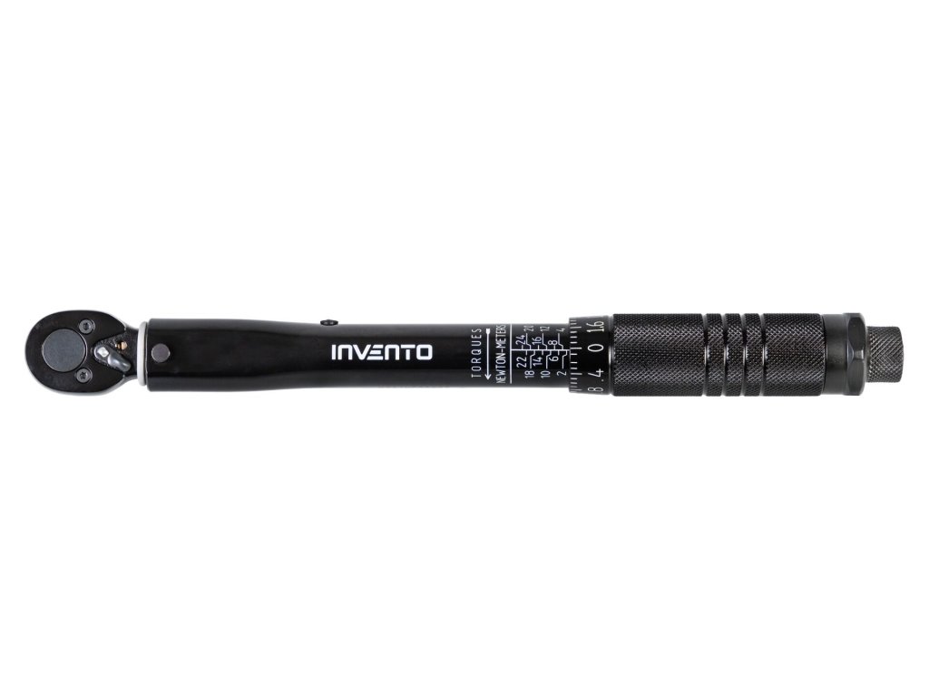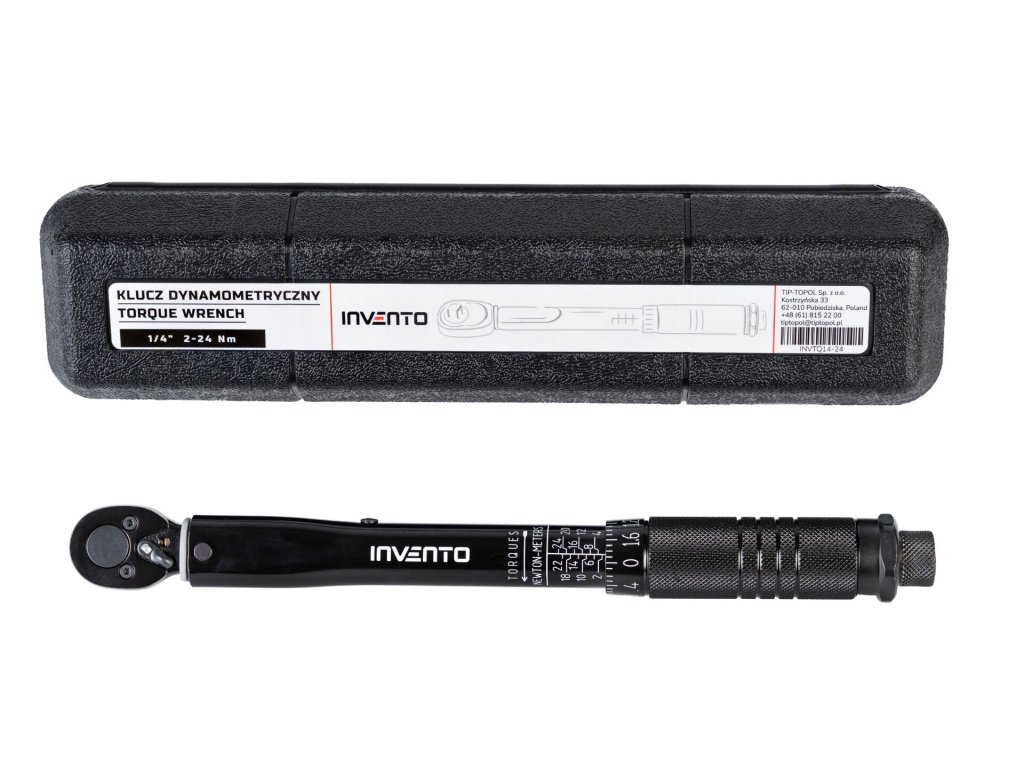 Momentový klíč Invento s čtyřhranem 1/4" je precizní nástroj s rozsahem momentu 2–24 Nm, určený pro jemné a přesné utahování spojovacích prvků. Díky vysoké přesnosti ±4 % a kalibračnímu certifikátu s individuálním sériovým číslem je ideální volbou pro profesionální použití v automobilovém a cyklistickém průmyslu i v domácí dílně.