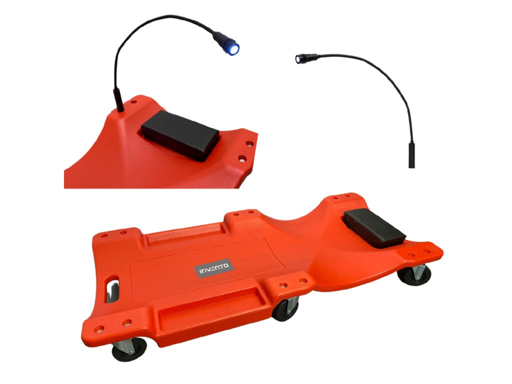 Dílenské lehátko INVENTO s integrovanou lampou je určeno pro profesionální autoservisy i domácí garáže. Díky zabudovanému osvětlení poskytuje optimální viditelnost při práci pod vozidlem nebo v těžko přístupných místech. Ergonomický tvar a pevná konstrukce zajišťují maximální pohodlí a dlouhou životnost.