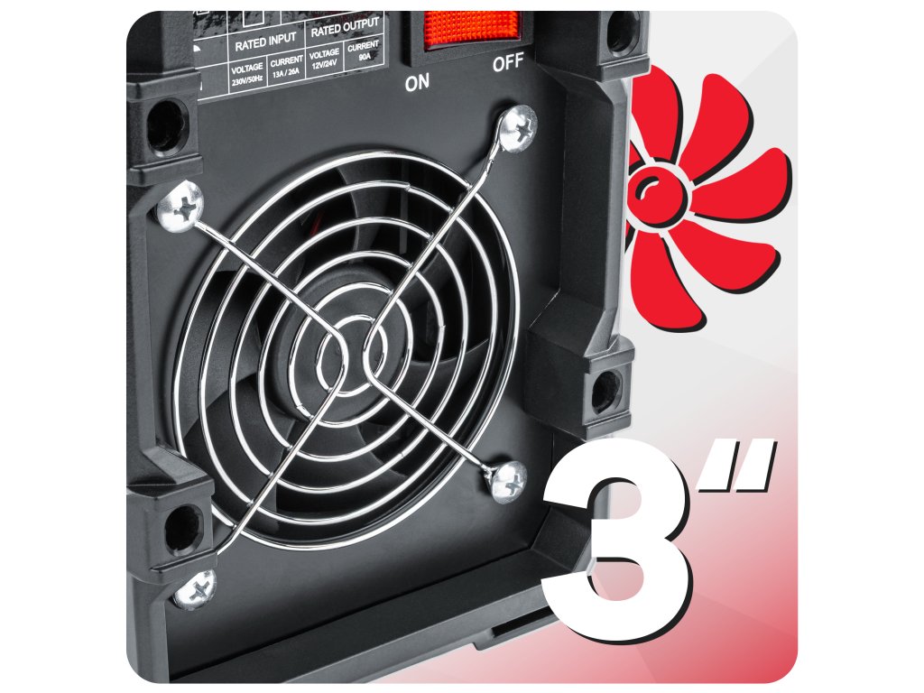 - Efektivní aktivní chlazení – 3" ventilátor automaticky reguluje otáčky podle teploty tranzistorů IGBT, zajišťuje tichý chod a chrání zařízení před přehřátím.