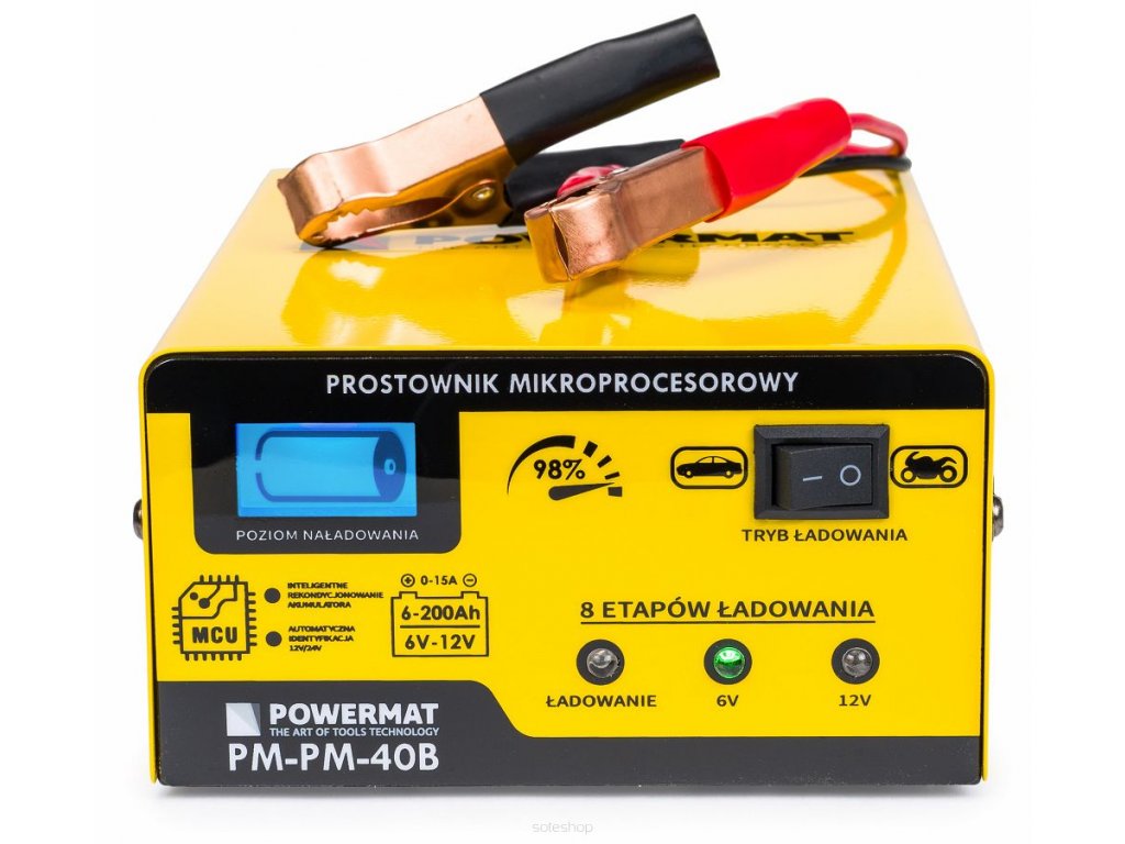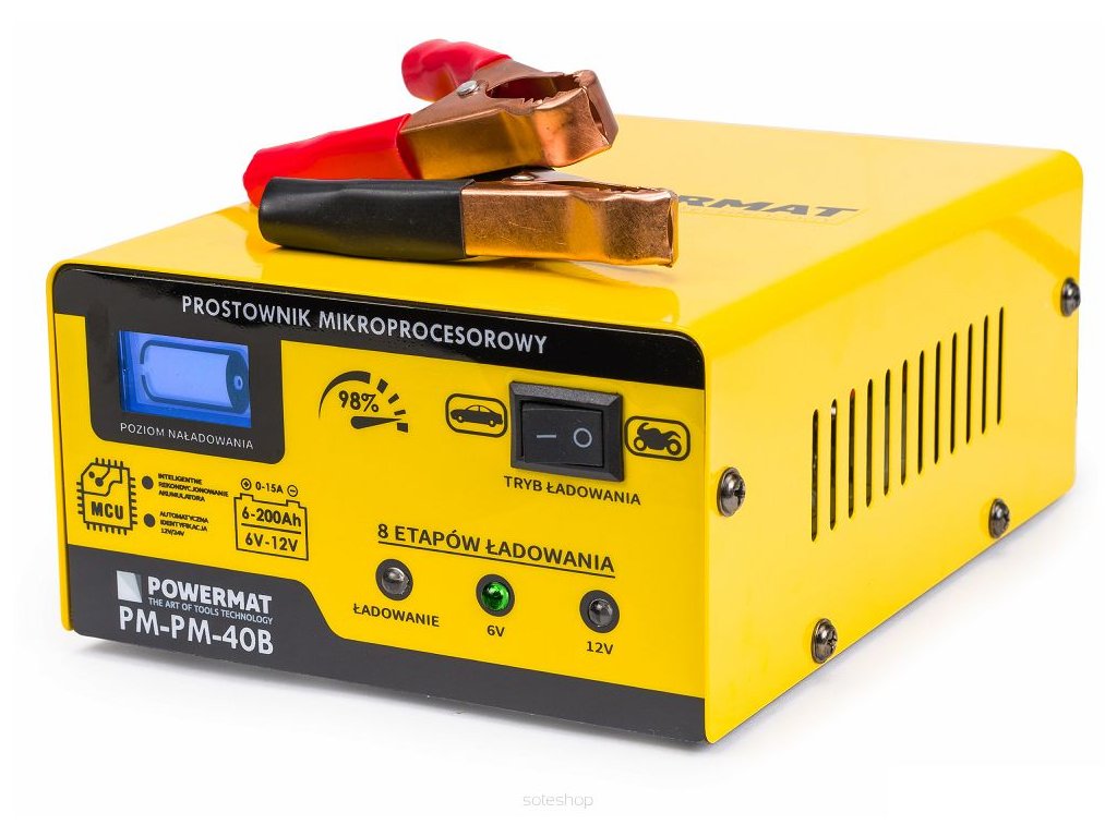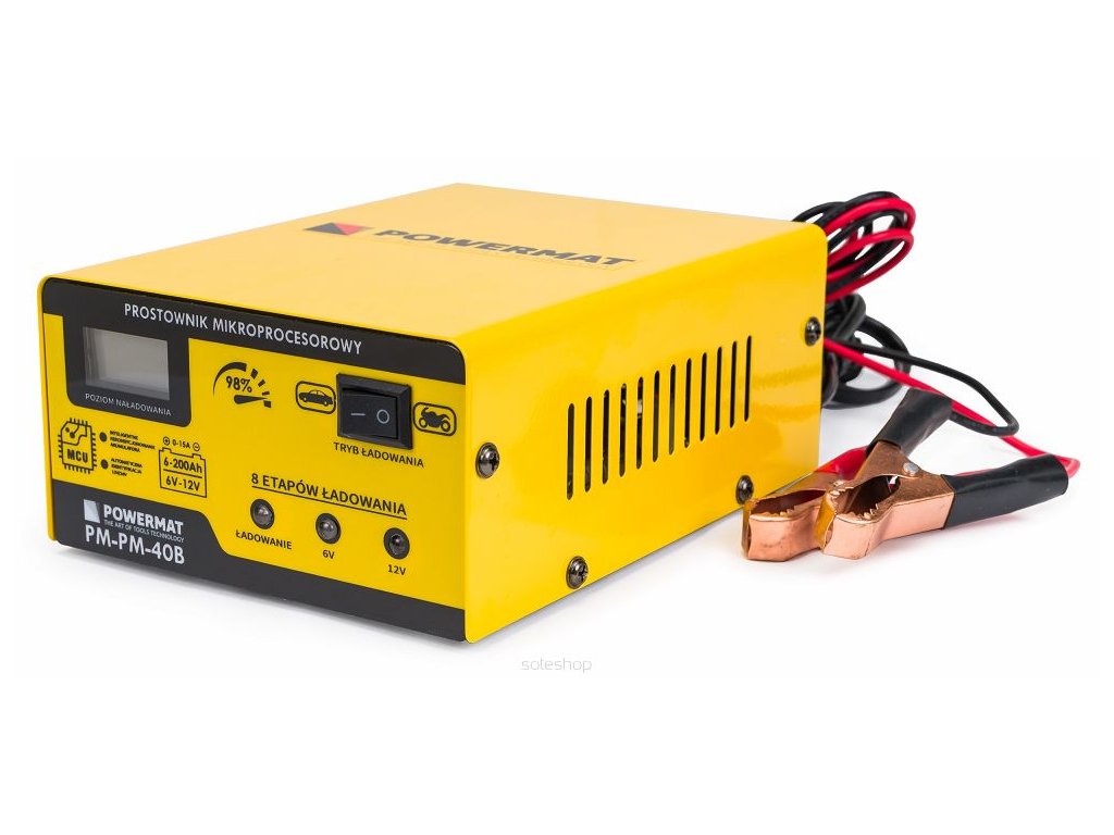 Nabíječka autobaterií mikroprocesorová 6/12V PM-PM-40B, Powermat PM0712 je první na trhu s mikroprocesorovým systémem řízení v PWM technologii pro nabíjení 6V a 12V baterií, který inteligentně a přesně volí odpovídající parametry pro regeneraci vybitých a zanedbaných baterií.