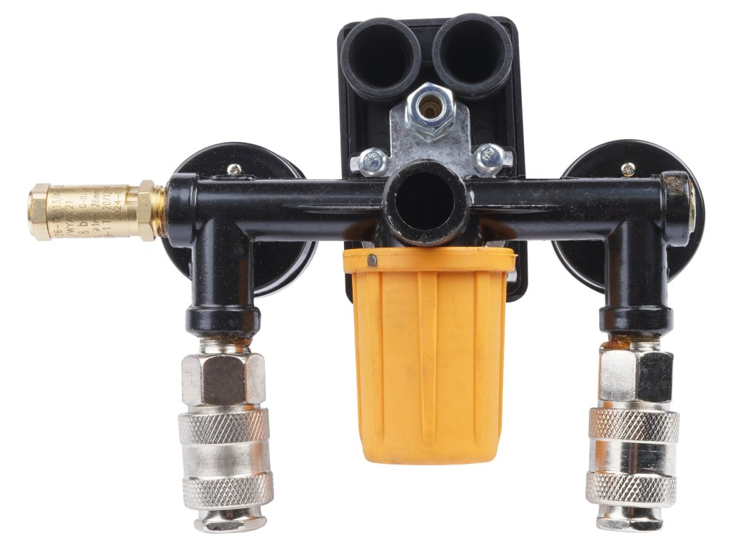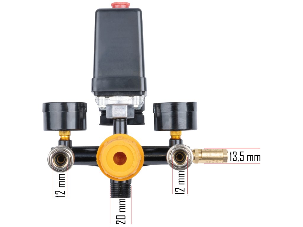 Tlakový spínač (presostat) je určen pro automatické řízení chodu kompresoru v závislosti na tlaku ve vzdušníku. Zajišťuje zapnutí a vypnutí zařízení při nastavených hodnotách, chrání kompresor před přetížením a přispívá k bezpečnému a stabilnímu provozu.