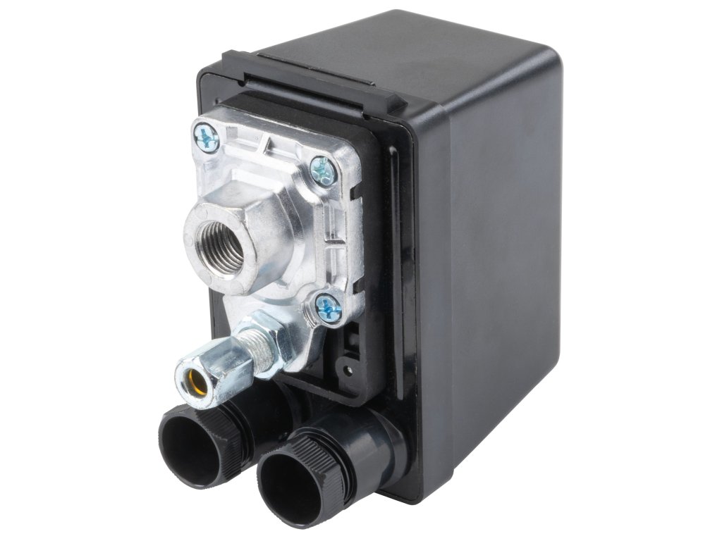 - Automatická regulace tlaku – spínač vypíná kompresor po dosažení maximálního tlaku a znovu jej zapíná při poklesu, čímž chrání zařízení před přetlakem.