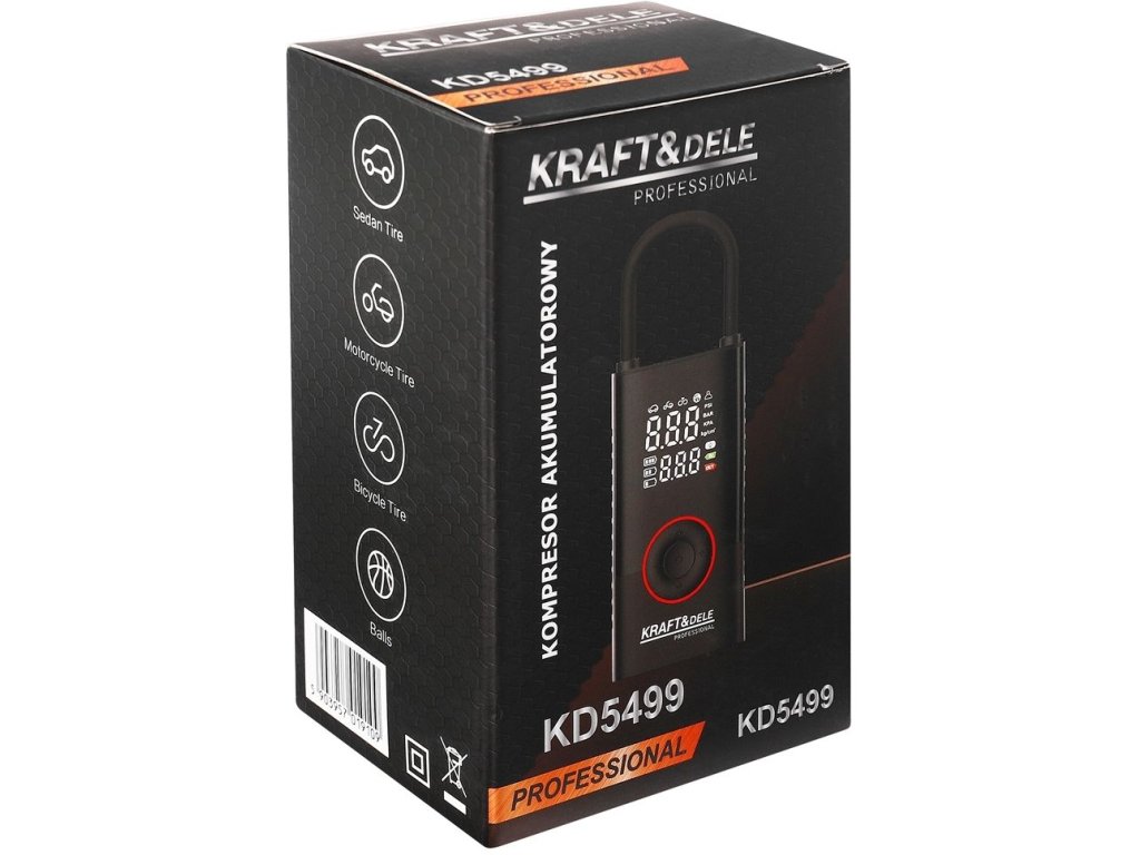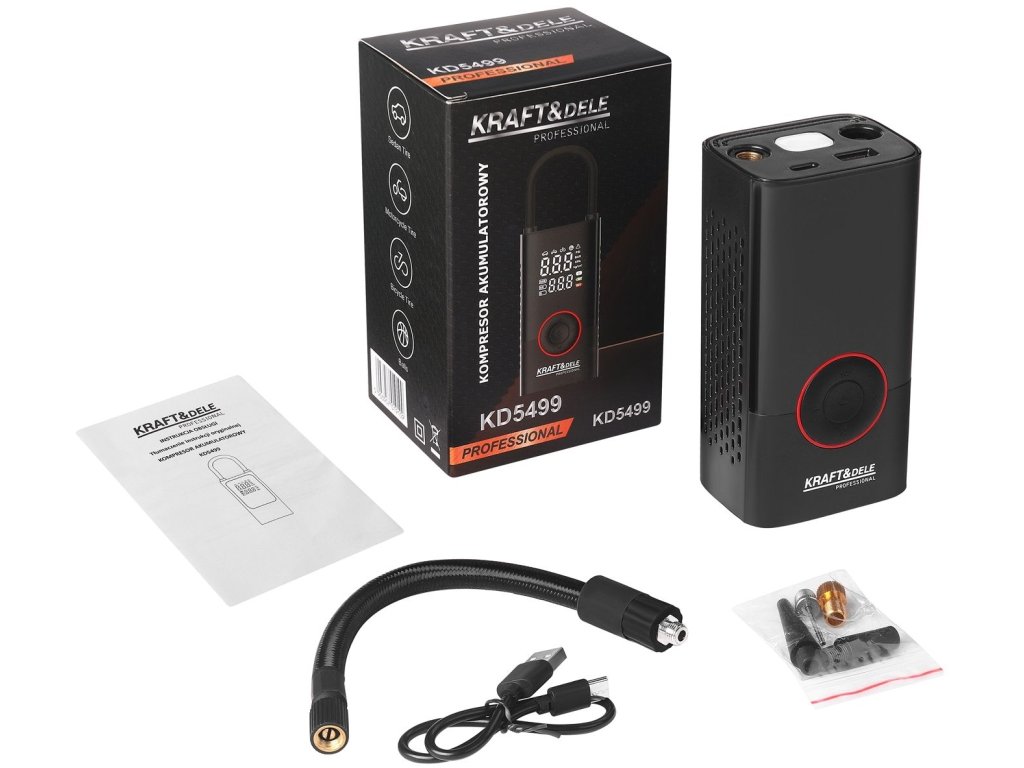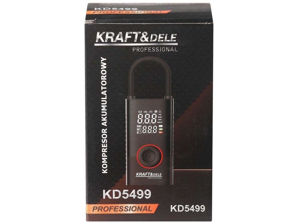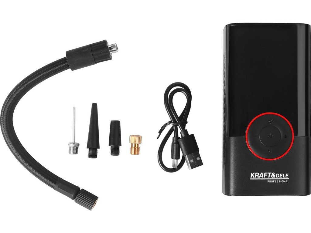 Model Kraft&Dele KD5499 je moderní přenosný akumulátorový kompresor, určený pro rychlé a pohodlné huštění pneumatik, míčů, matrací či jiných nafukovacích doplňků. Díky vestavěnému akumulátoru s celkovou kapacitou 4000 mAh a integrované LED svítilně je ideálním pomocníkem do dílny, auta i na cesty.