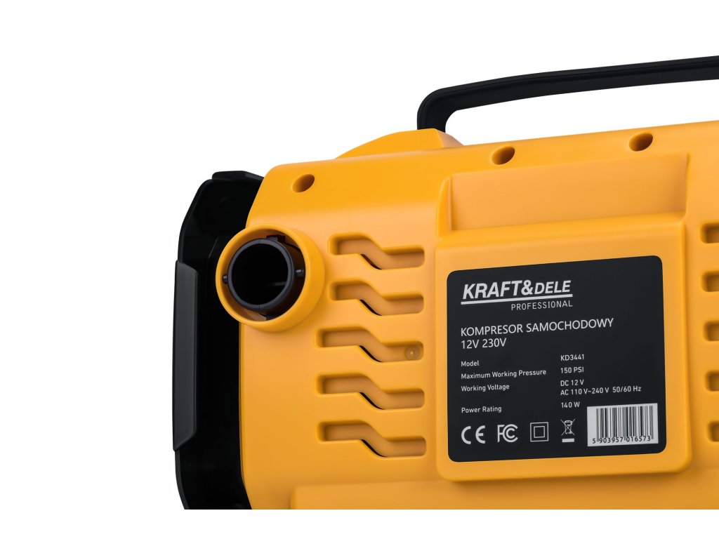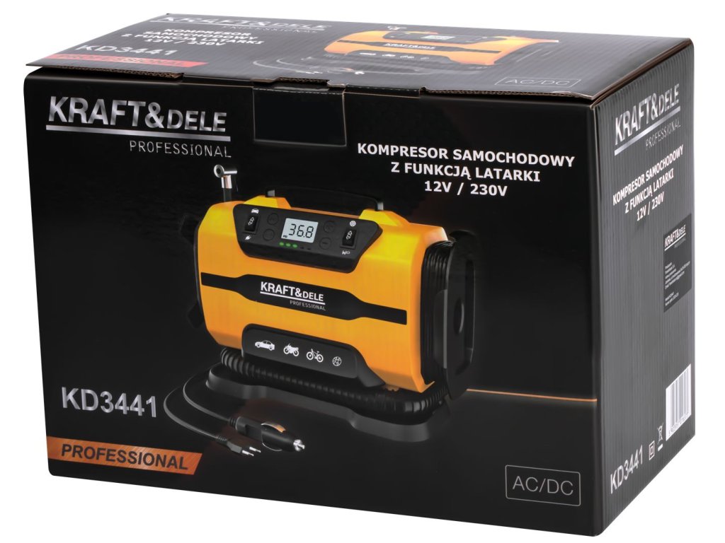 Kompresor automobilový KD3441 je univerzální a mobilní zařízení, které se skvěle hodí jak na cesty, tak do domácí garáže. Díky dvěma zdrojům napájení – 12V DC (zásuvka zapalovače) a 230V AC – je připraven k použití v každých podmínkách.