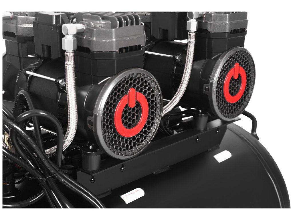Díky dvěma motorům o výkonu 2200 W každý a maximální výkonnosti 585 l/min kompresor bez problémů zásobuje pneumatické nářadí vzduchem a umožňuje dlouhodobou, stabilní práci. Robustní kovové madlo a čtyři velká kolečka usnadňují přesun zařízení. Dva přehledné manometry, tichý chod 70 dB a ochrana proti přetížení zajišťují bezpečnost a komfort při používání.