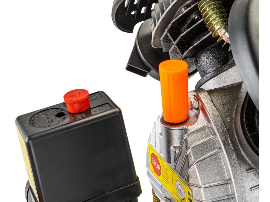 Automatický tlakový spínač aktivuje kompresor při poklesu tlaku pod 6 bar a vypne ho při dosažení 8 bar. Bezpečnostní ventil chrání proti nekontrolovanému zvýšení tlaku a zařízení disponuje také tepelnou ochranou.