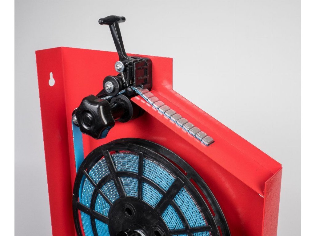 Profesionální kovový stojan na samolepicí závaží v rolce s řezacím nožem – červený