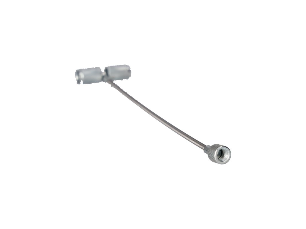Přípravek se skládá z odolné kovové rukojeti s integrovaným odvzdušňovacím čepem a šroubovákem na vložky ventilků, pružné ocelové lankové šňůry s opletem a závitového držáku pro zachycení ventilu. Všechny části jsou navrženy s důrazem na odolnost, funkčnost a komfort použití.