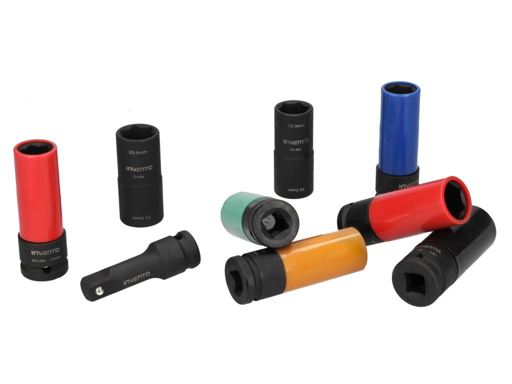 Profesionální sada rázových hlavic INVENTO 1/2" je určena pro bezpečnou a přesnou práci s hliníkovými disky vybavenými nestandardními šrouby a maticemi kol, používanými u vybraných značek osobních vozidel, jako jsou Ford, Tesla, Kia, Hyundai a Mercedes.