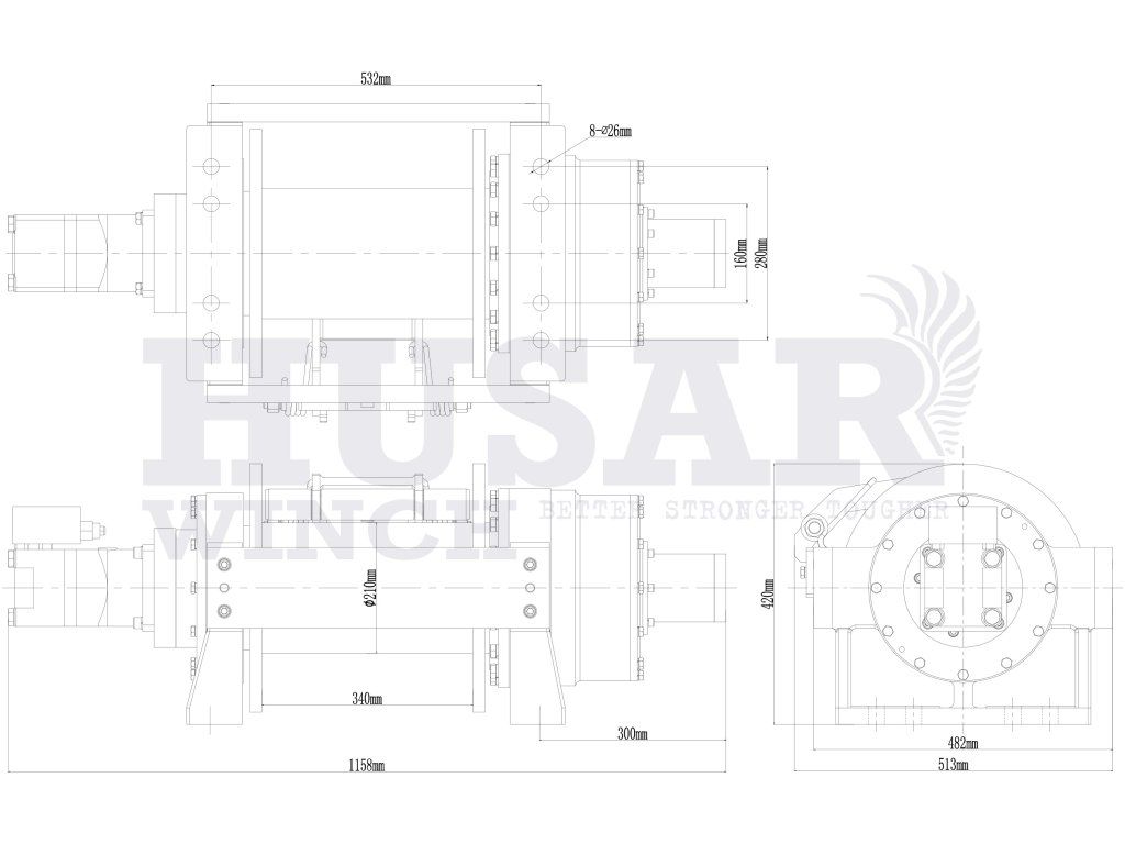 Hydraulický naviják Husar Winch BST H 45000 LBS je extrémně výkonné zařízení určené pro nejnáročnější průmyslové aplikace, kde je vyžadována maximální tažná síla a absolutní spolehlivost. Tento model je navržen pro práci v extrémních podmínkách, kde běžná zařízení nestačí.