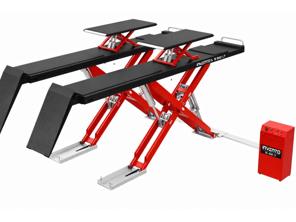 INVENTO SL 552 LT je profesionální nůžkový zvedák s nosností 5 500 kg, určený pro měření geometrie náprav. Platformy o délce 5 208 mm jsou vybaveny vybráními pro točnice a zadní posuvné desky (rozpěrné desky), které jsou součástí balení.