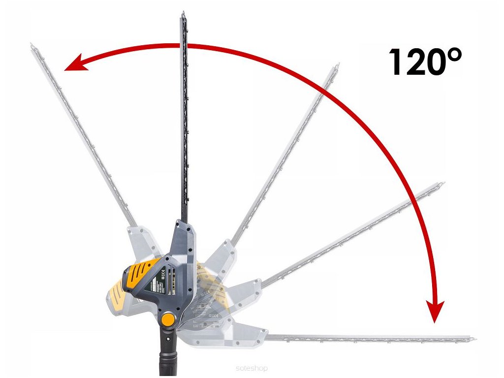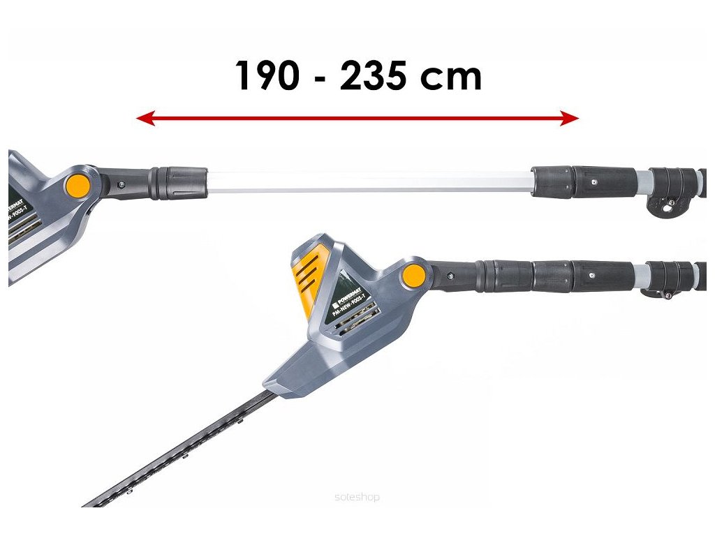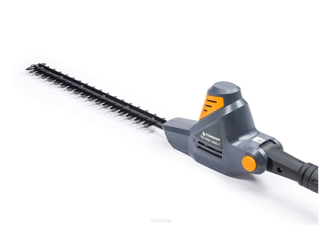 Elektrické nůžky na živý plot PM-NEW-900S-T 45CM 900W, Powermat PM0618 s vysoce kvalitním čepelí z vysokouhlíkové oceli. Možnost rychlé a snadné regulace délky ramene v rozmezí od 190 cm do 234 cm a možnost regulace úhlu náklonu nůžek ve pěti stupních velmi usnadňuje stříhání keřů. Elektrický motor o výkonu 900 W umožňuje stříhat větve do průměru 18 mm.