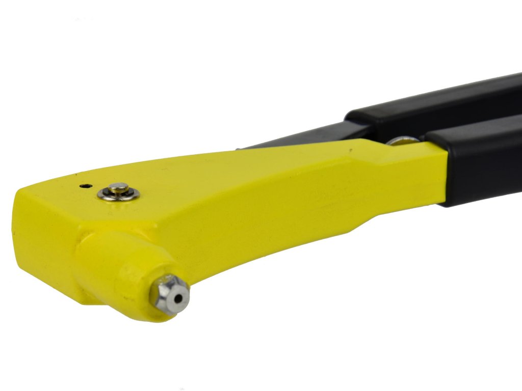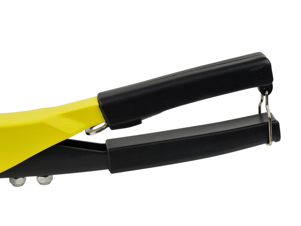 Pevné ruční nýtovací kleště vhodné pro hliníkové a měděné nýty o rozměrech 2,4/3,2/4,0/4,8 mm. Je to nástroj užitečný prakticky v každé domácnosti, který se používá ke spojení dvou materiálů dohromady, například: ocelové ploché tyče, hliníkové ploché tyče, kůže, PVC, plech a další materiály. Nýtovací kleště jsou vybaveny četnými zesílenými prvky, což zajišťuje delší životnost a ergonomická pogumovaná rukojeť zajišťuje pevný a pohodlný úchop. Sada obsahuje 4 vyměnitelné hroty o velikostech: 2,4 / 3,2 / 4,0 / 4,8 mm. Nýtovací kleště jsou dodávány s klíčem pro výměnu hrotů.