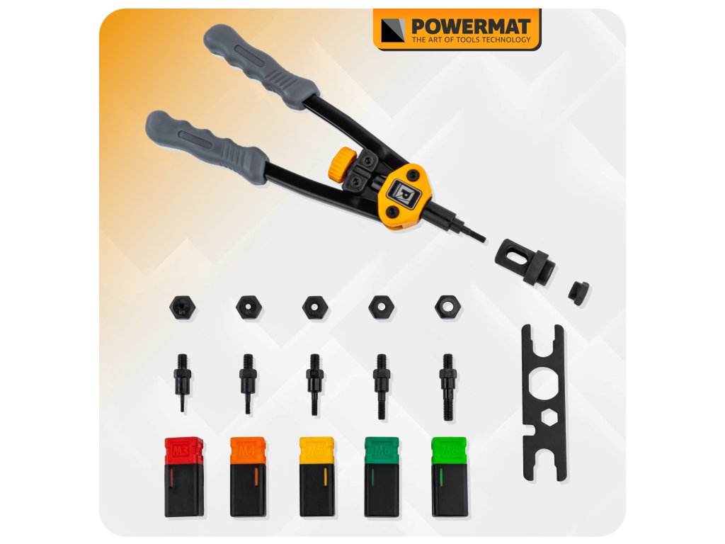 - Podporované velikosti nýtovacích matic: M3, M4, M5, M6, M8