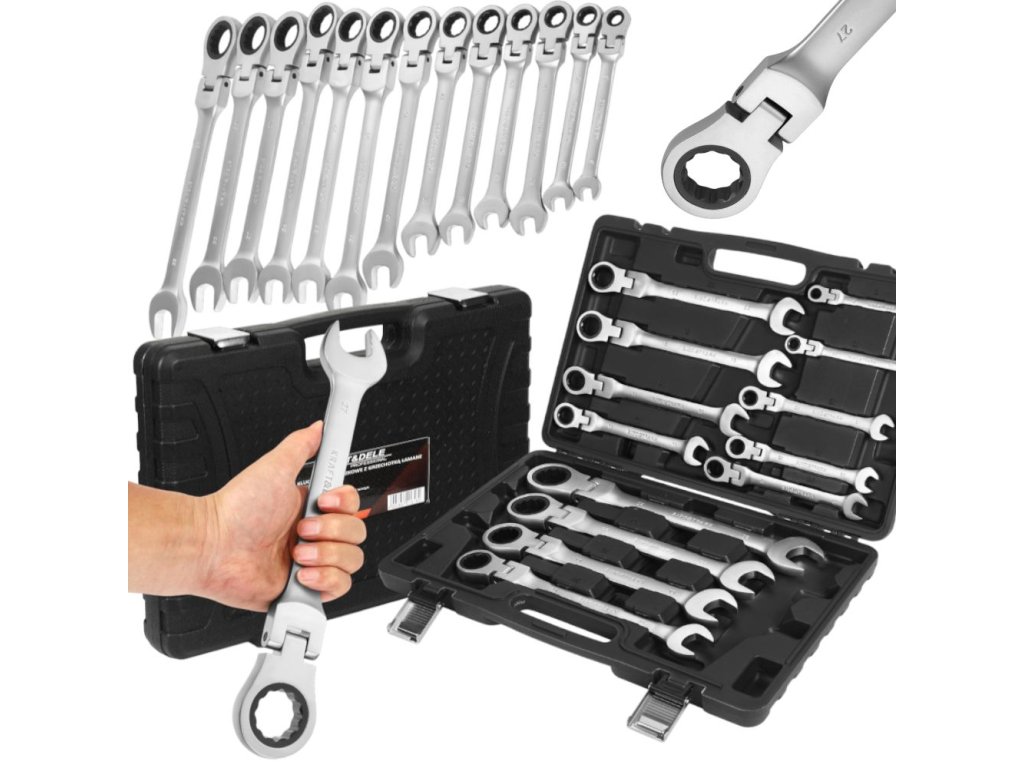 Sada 13 kusů plochých–očkových klíčů s ráčnou a lámacím kloubem je praktickým řešením pro každý autoservis, dílnu i domácí garáž. Klíče jsou vyrobeny z pevné chrom-vanadiové oceli (CrV), která zajišťuje vysokou odolnost proti opotřebení a dlouhou životnost.