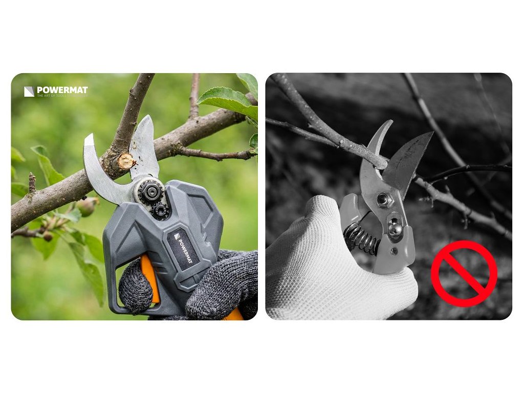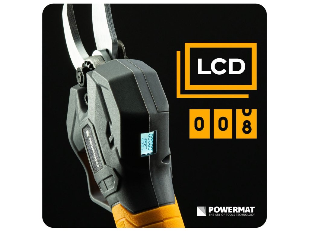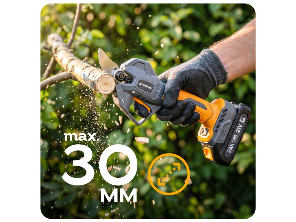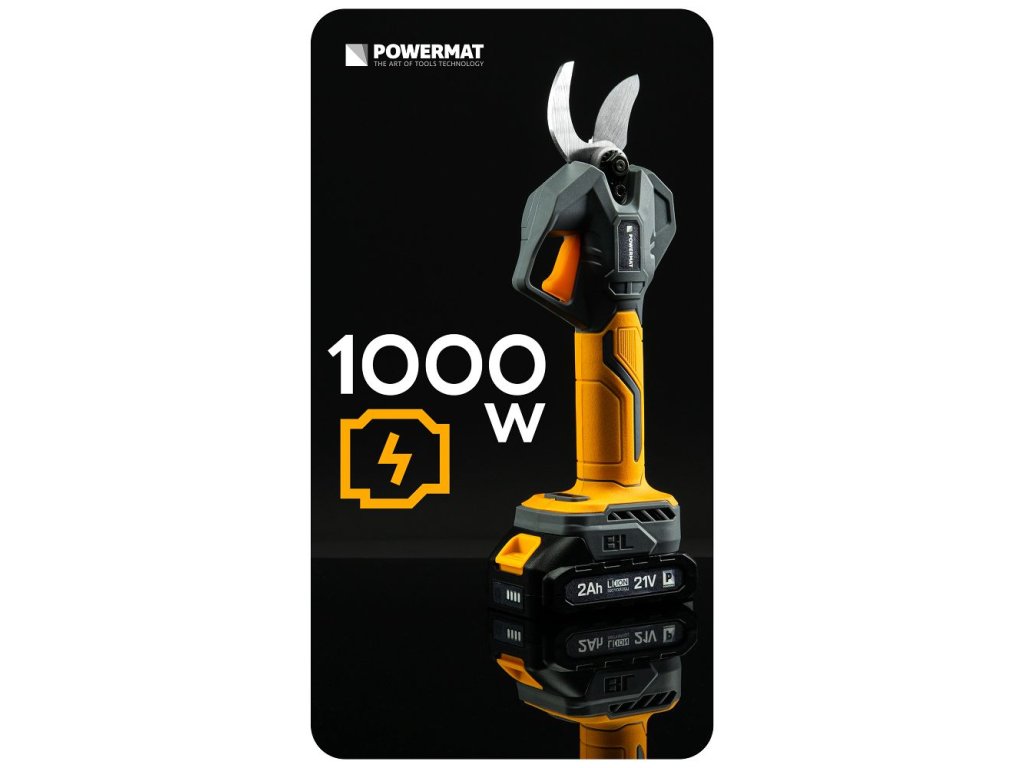 Akumulátorové zahradní nůžky Powermat PM-SA-21V-2AM jsou určeny pro rychlé a přesné stříhání větví v zahradě, sadu nebo vinici. Díky bezkartáčovému motoru a maximálnímu výkonu 1000 W umožňují snadné stříhání větví až do průměru 30 mm. Dva akumulátory 21 V zajišťují delší dobu práce bez přerušení a LCD displej poskytuje přehled o stavu baterie a počtu provedených střihů.